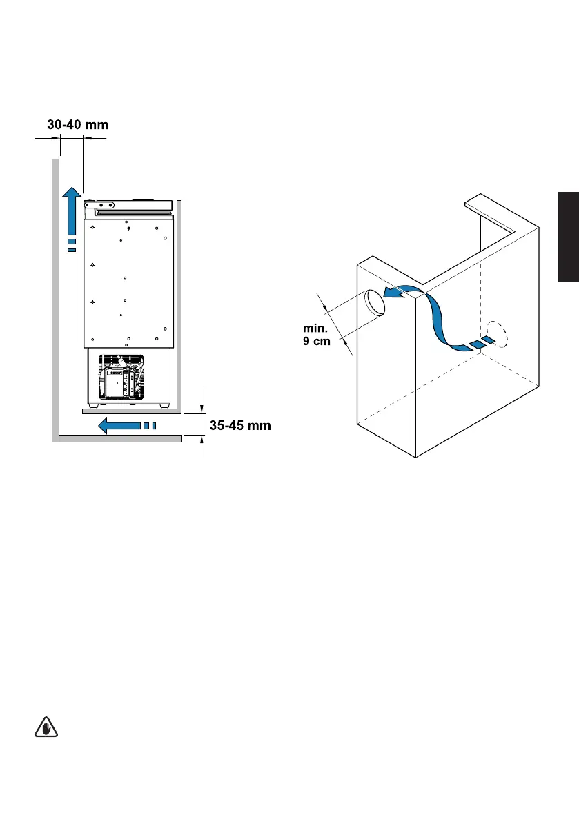 unten zuströmen und hinter dem Kühlschrank vorbeiströmen kann, und dass warme Luft oben und seitlich austritt.