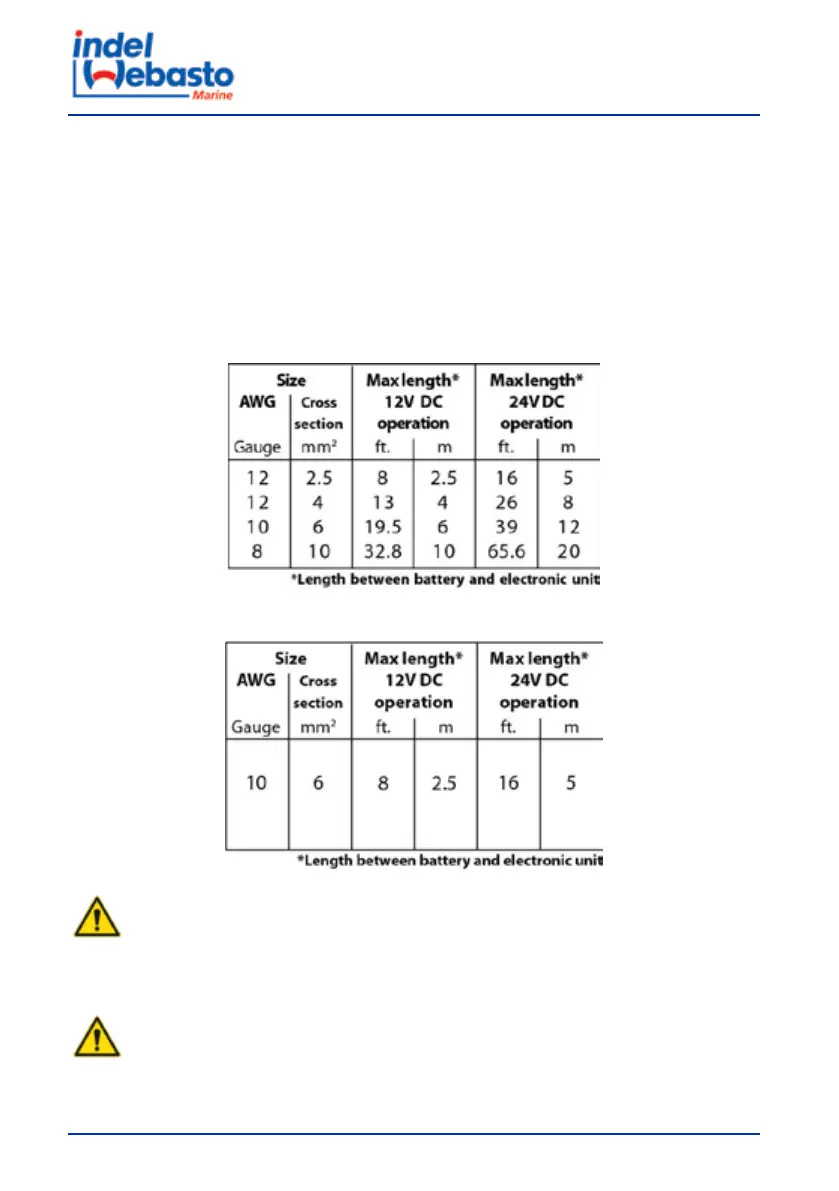 Always use suitably sized cables with minimum secons as indicated in the table.