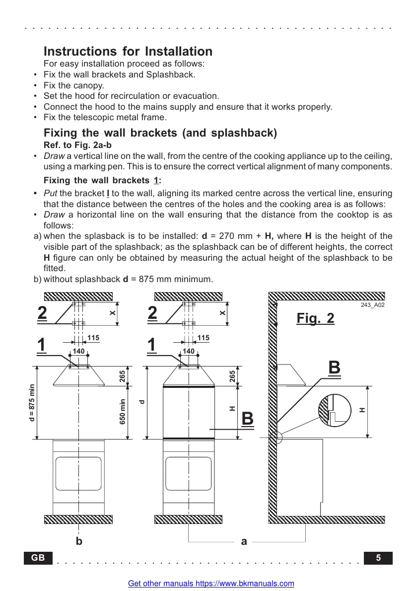 a) when the splasback is to be installed: d = 270 mm + H, where H is the height of the