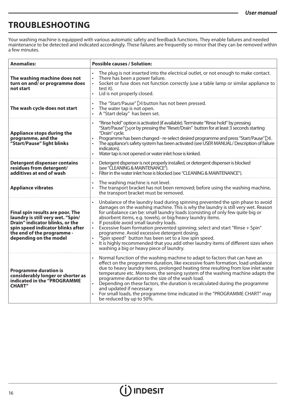 • Unbalance of the laundry load during spinning prevented the spin phase to avoid