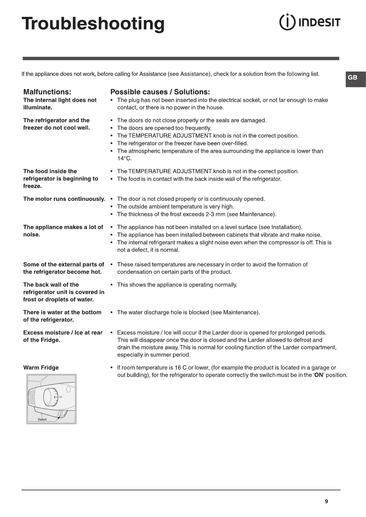 Indesit CA 55 Series - Troubleshooting; Malfunctions and Solutions