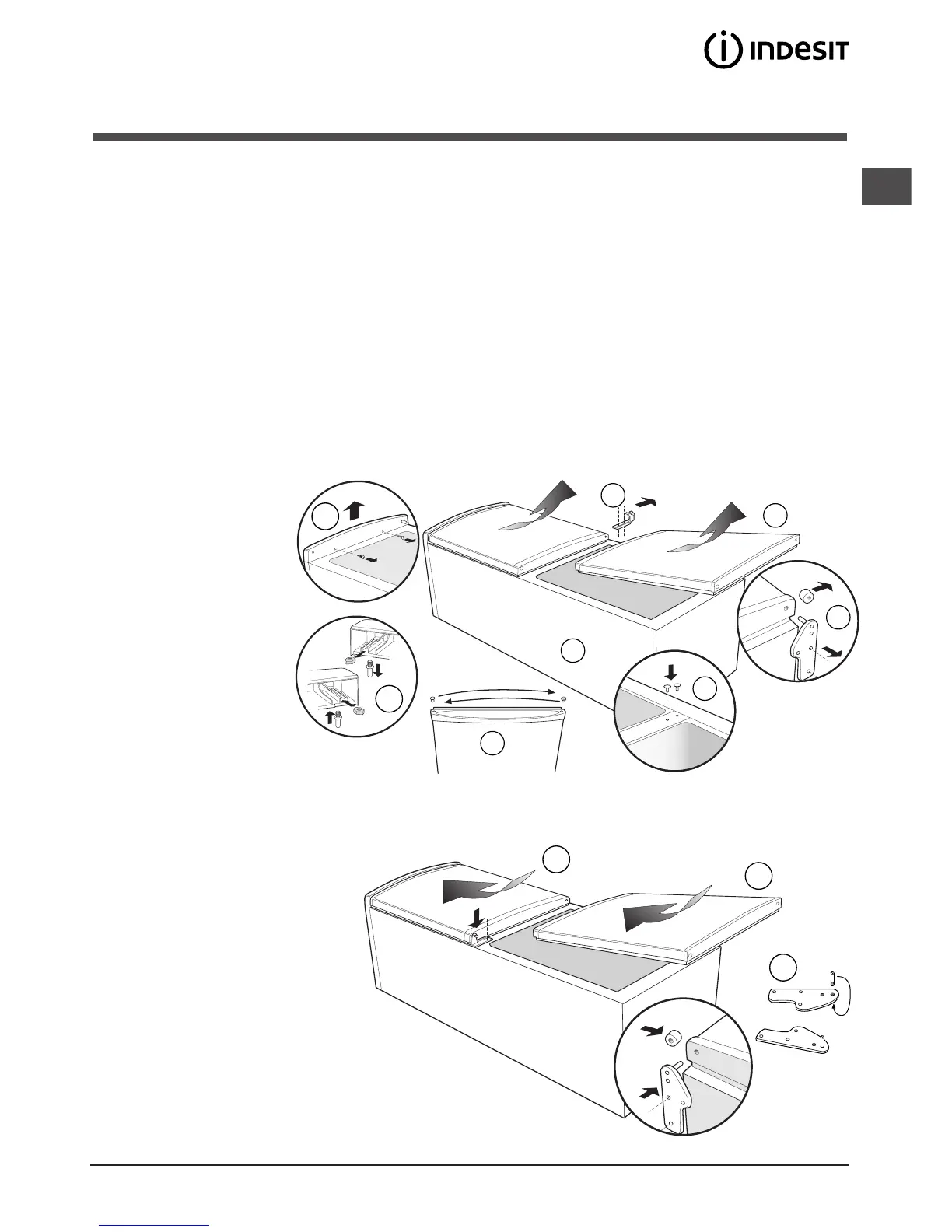 1. Slide the top door upwards and locate the top hinge pin into the door brush. Reposition the centre hinge on the