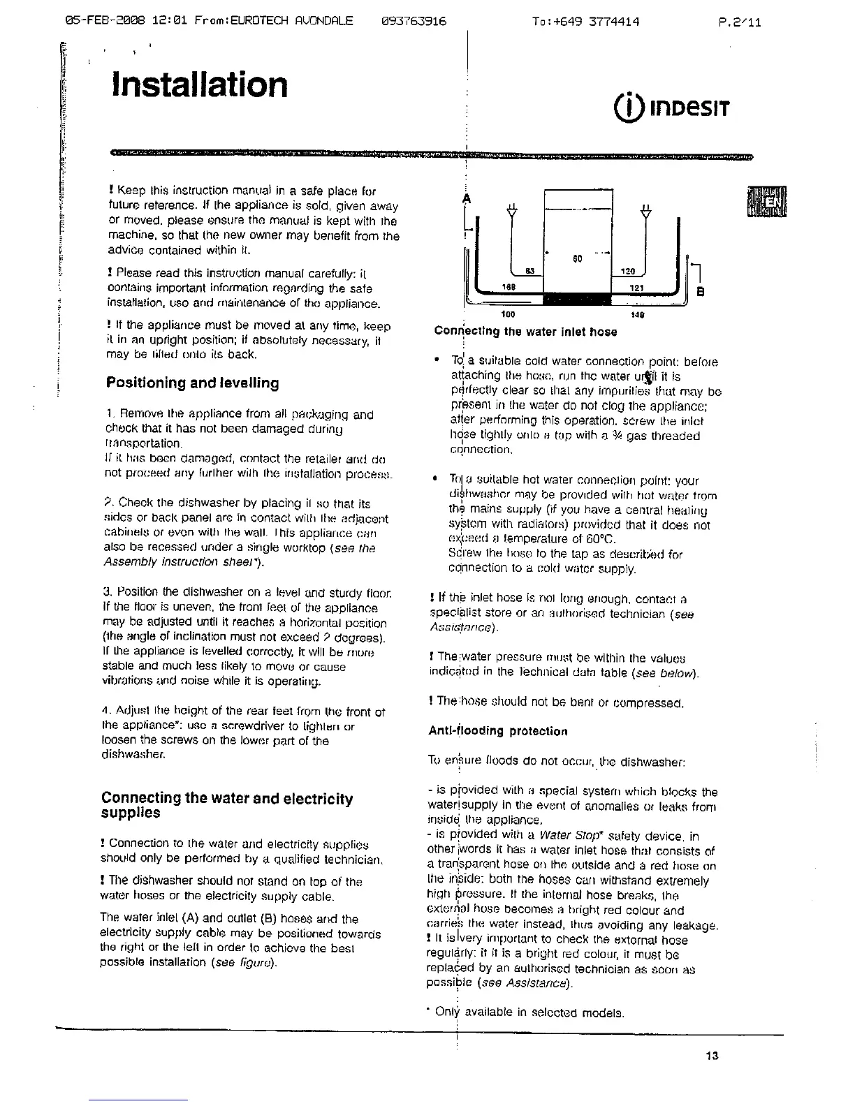 Indesit DI 623 - Installation; Positioning and Levelling; Connecting the Water and Electricity Supplies; Anti-Flooding Protection