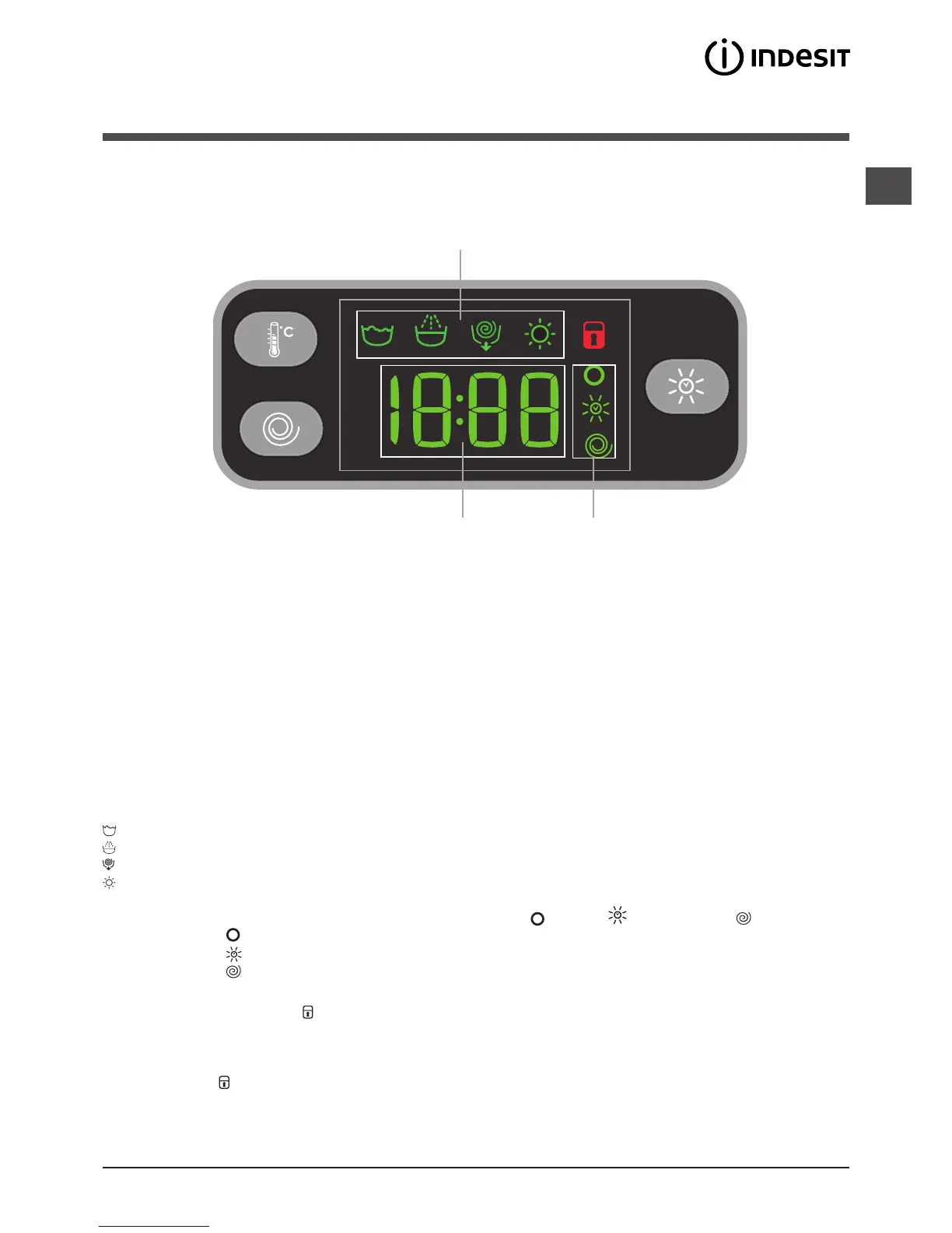 V části C se nacházejí, v pořadí shora dolů, ikony týkající se „teploty“ , „Sušení„ a „odstřeďování“ :