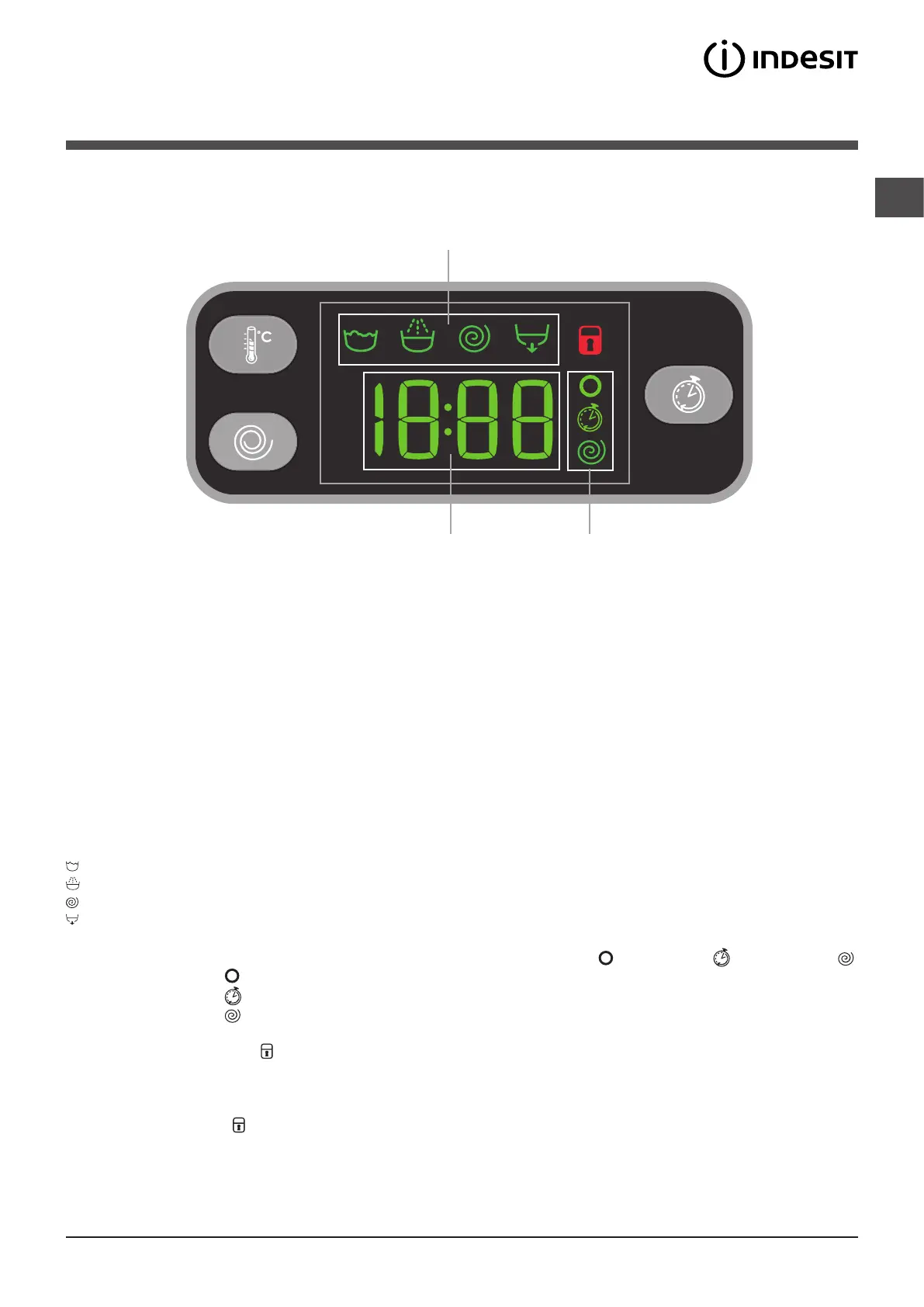 Im Abschnitt C sind folgende Ikonen angeordnet, von oben nach unten: “Temperatur” , “Startvorwahl” und “Schleuder” :