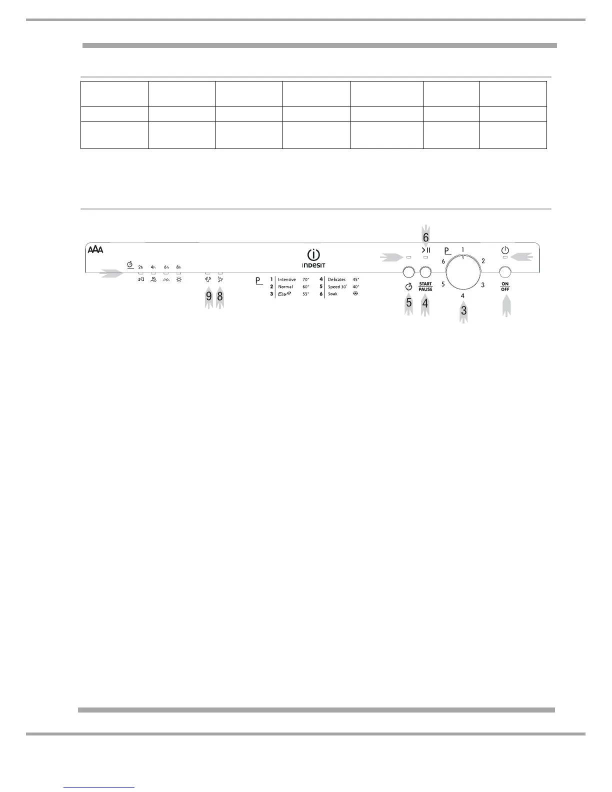 4. Start Pause Button. Push to start the cycle, if pushed when a programme is in progress, the