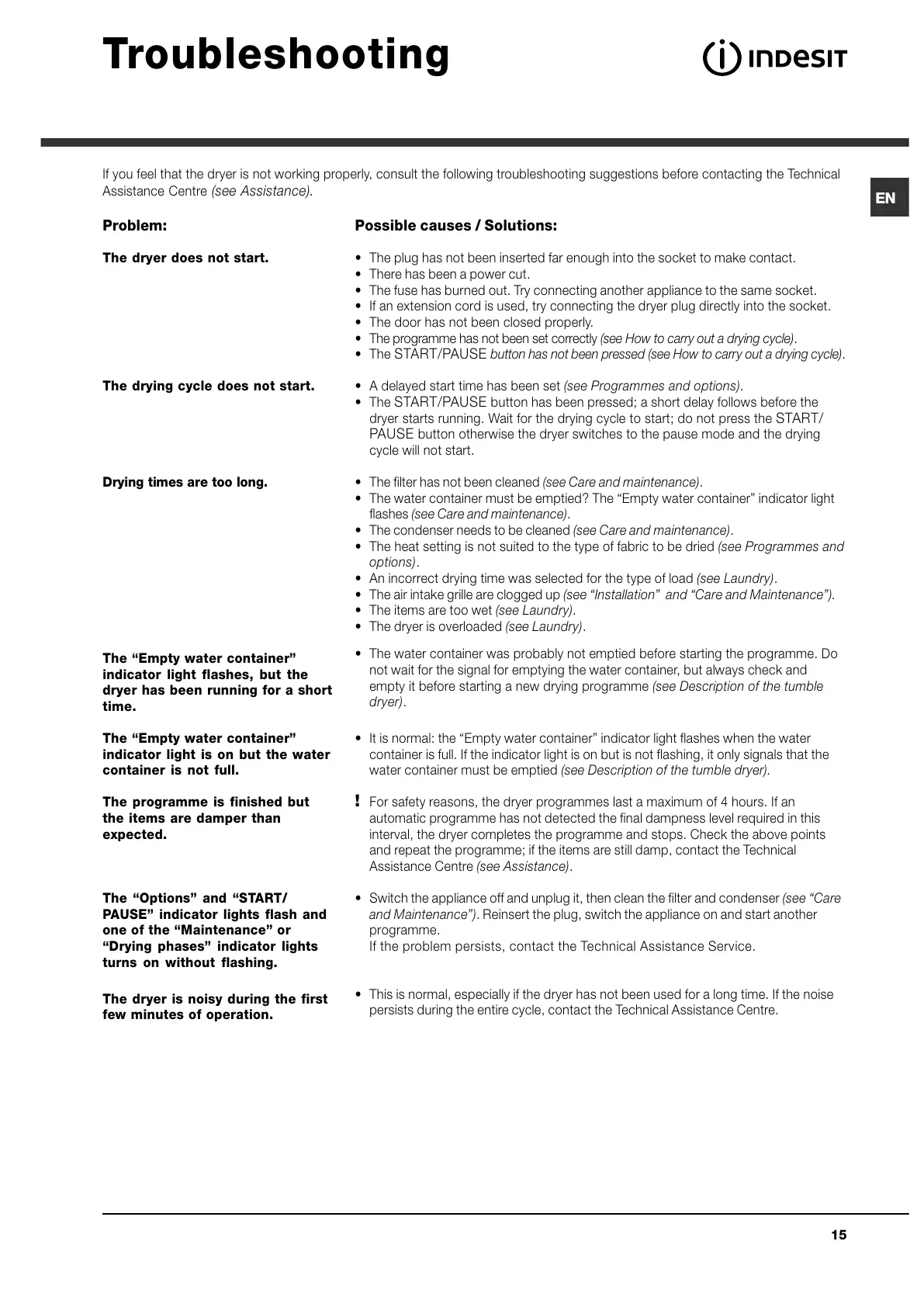 If you feel that the dryer is not working properly, consult the following troubleshooting suggestions before contacting the Technical