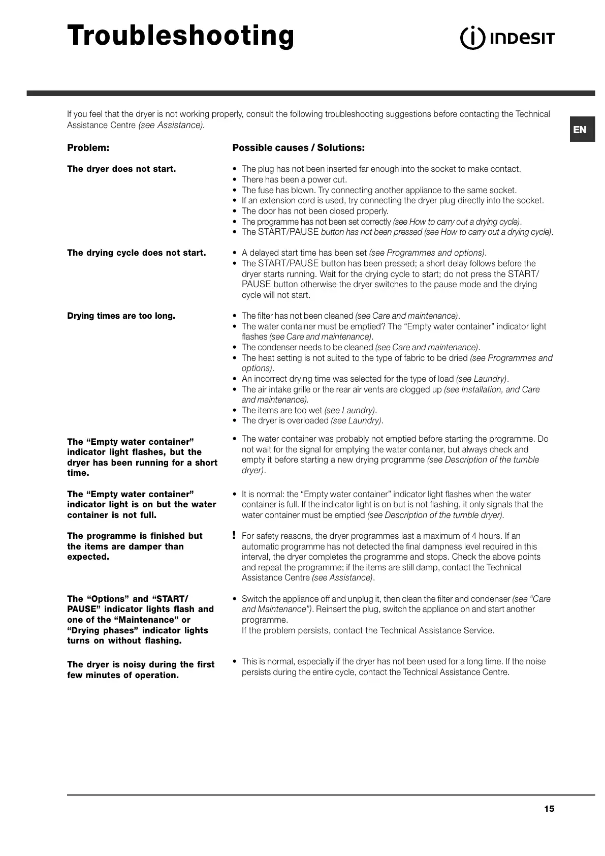 If you feel that the dryer is not working properly, consult the following troubleshooting suggestions before contacting the Technical