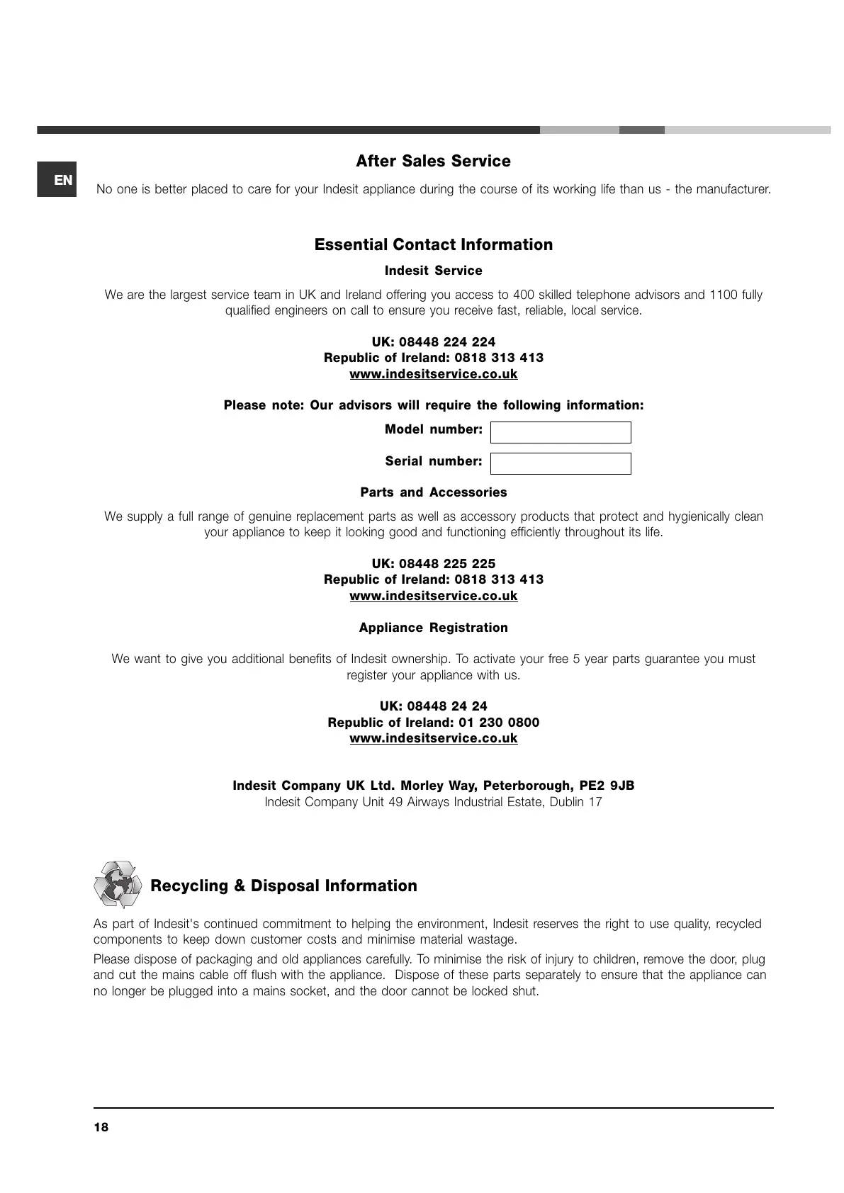 As part of Indesit's continued commitment to helping the environment, Indesit reserves the right to use quality, recycled