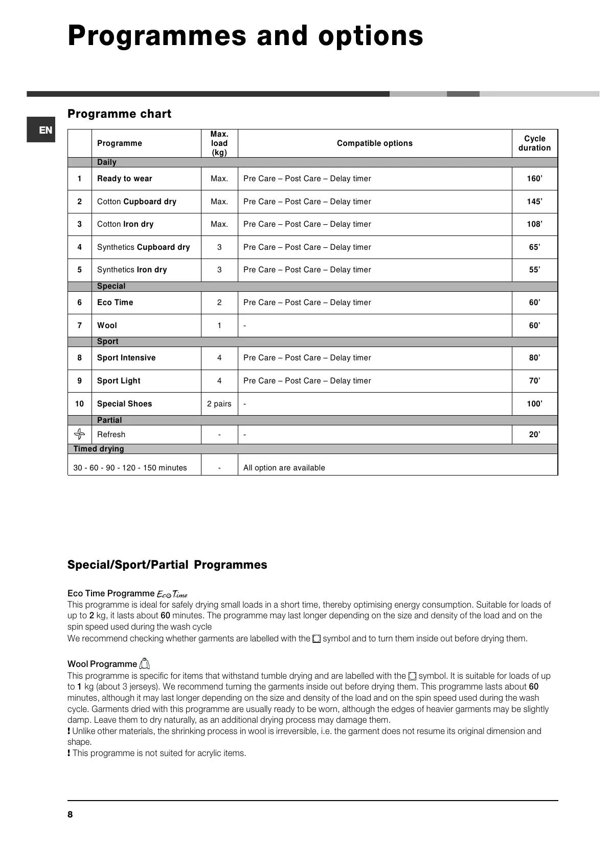 cycle. Garments dried with this programme are usually ready to be worn, although the edges of heavier garments may be slightly