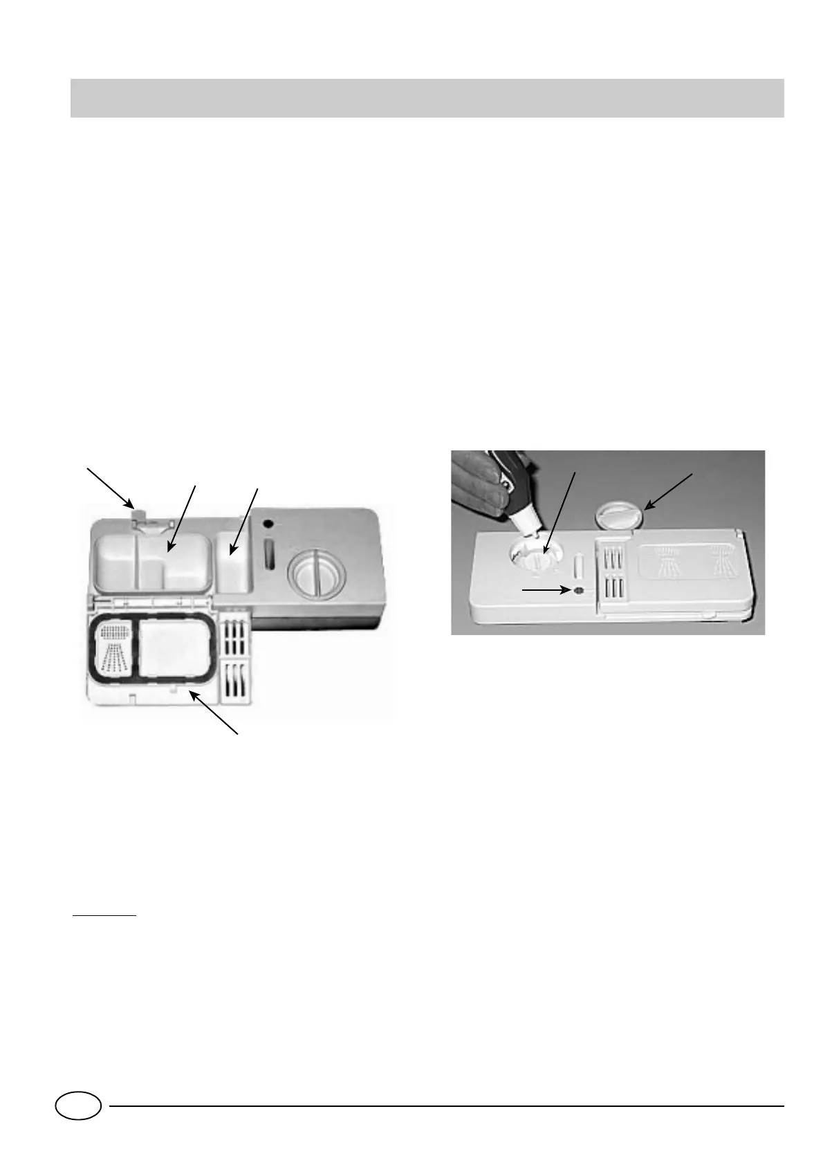 "B". Het afwasmiddel wordt in de twee bakjes "C", "D"