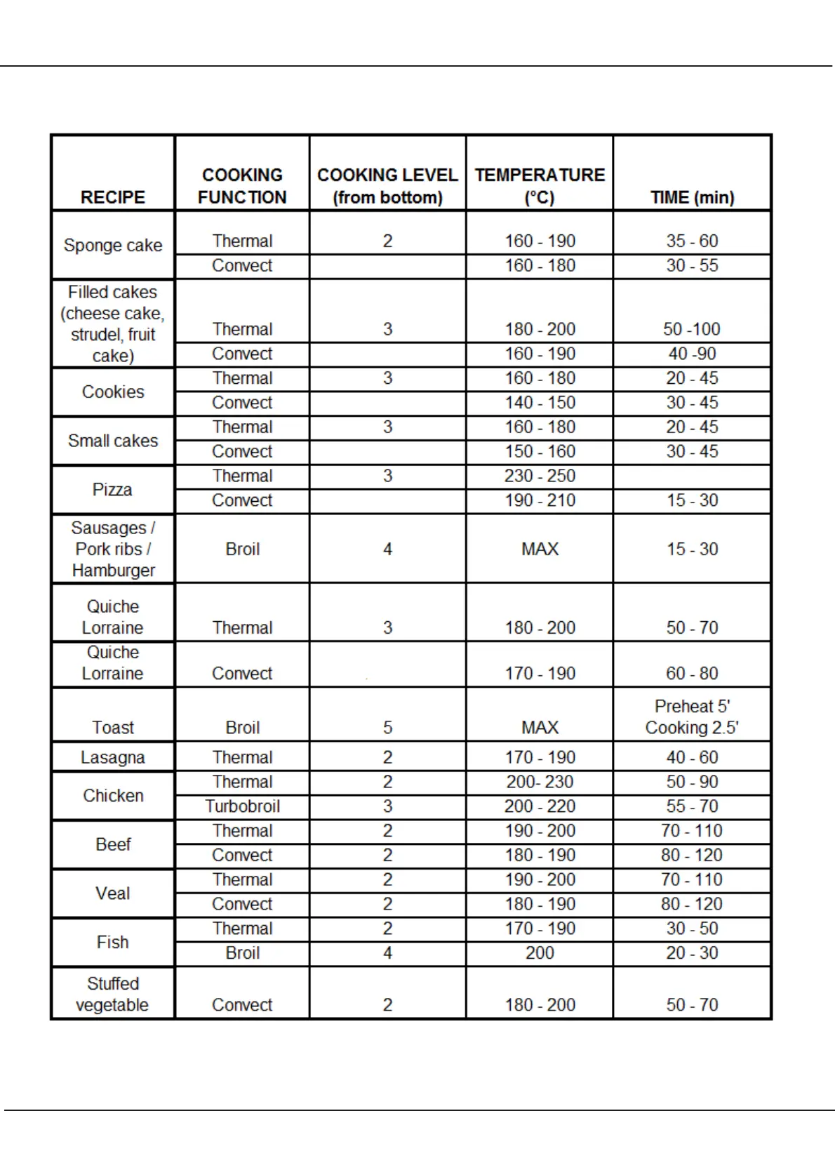 Indesit IS5V8CHX/E - Cooking Table and Recommendations; Recipe Cooking Guide and Parameters