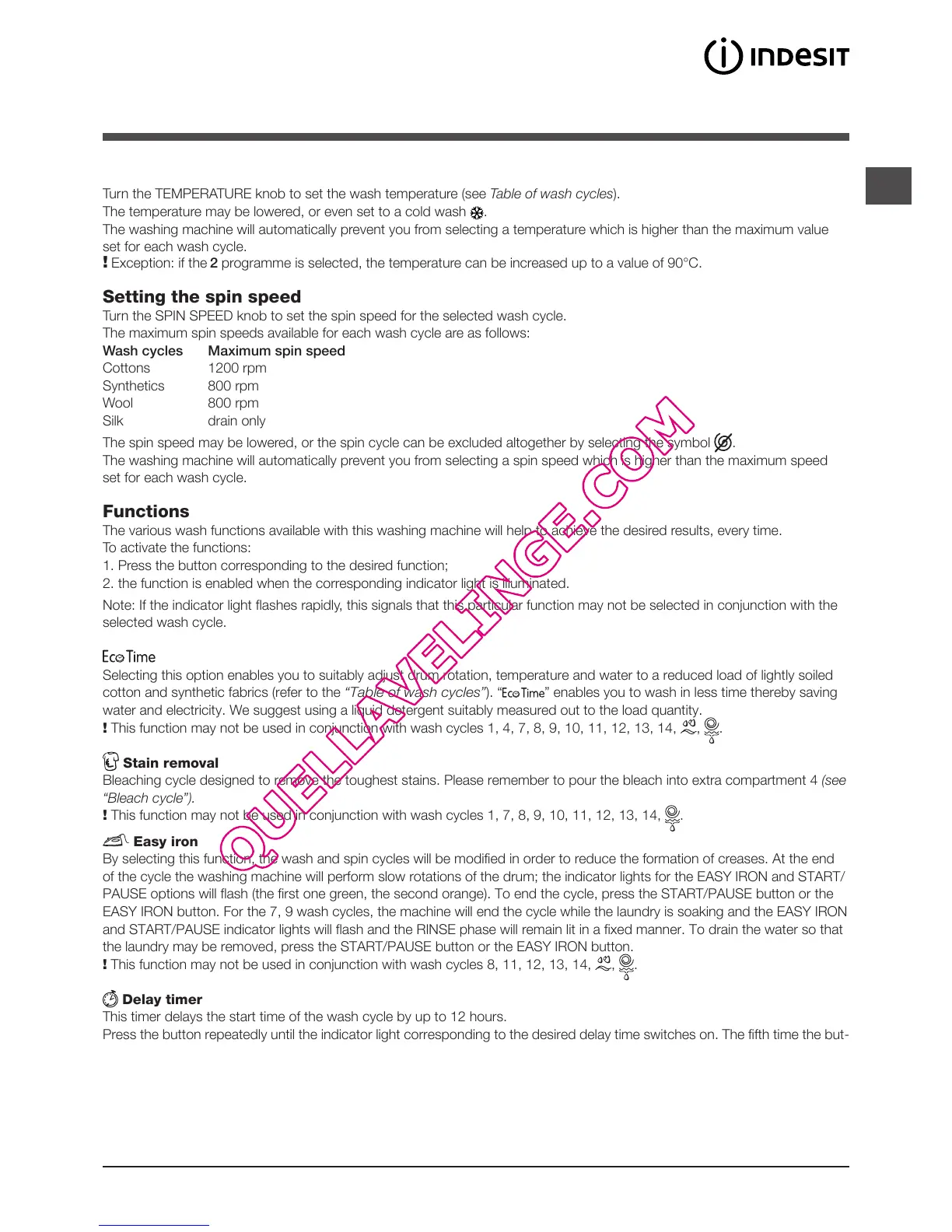 By selecting this function, the wash and spin cycles will be modified in order to reduce the formation of creases. At the end