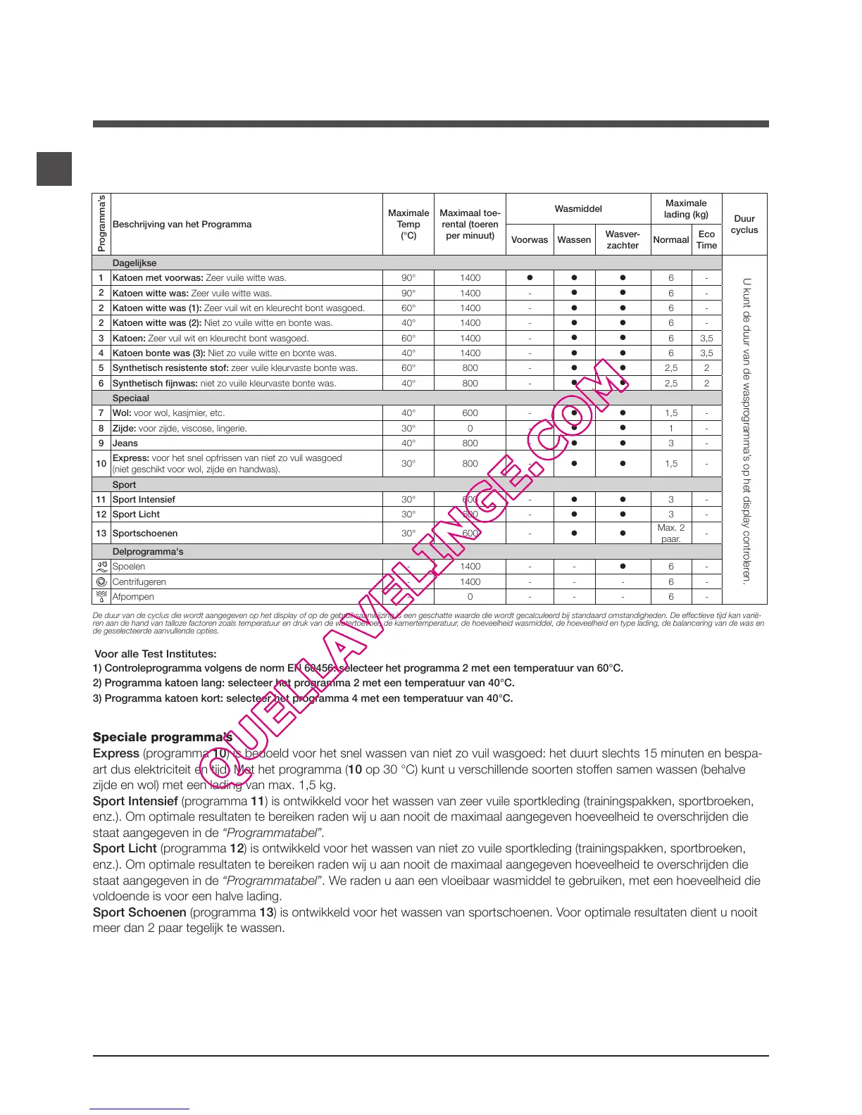 staat aangegeven in de “Programmatabel”. We raden u aan een vloeibaar wasmiddel te gebruiken, met een hoeveelheid die