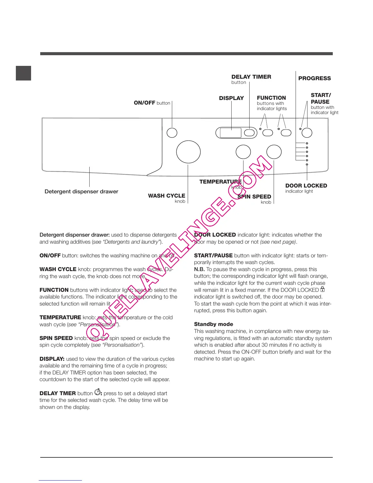 WASH CYCLE knob: programmes the wash cycles. Du-