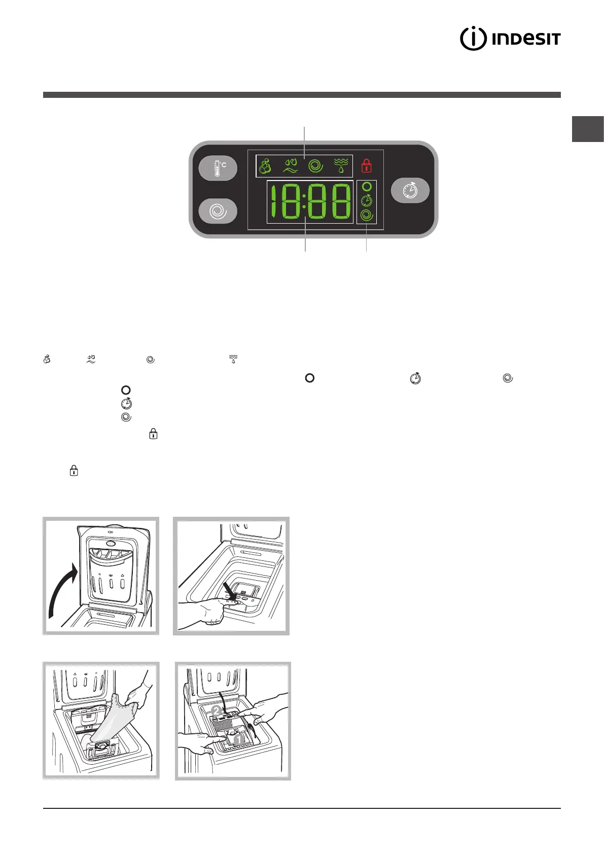 I området C vises - oppefra og ned - ikonerne for “temperatur” , “Programmeret start” og “centrifugering” :