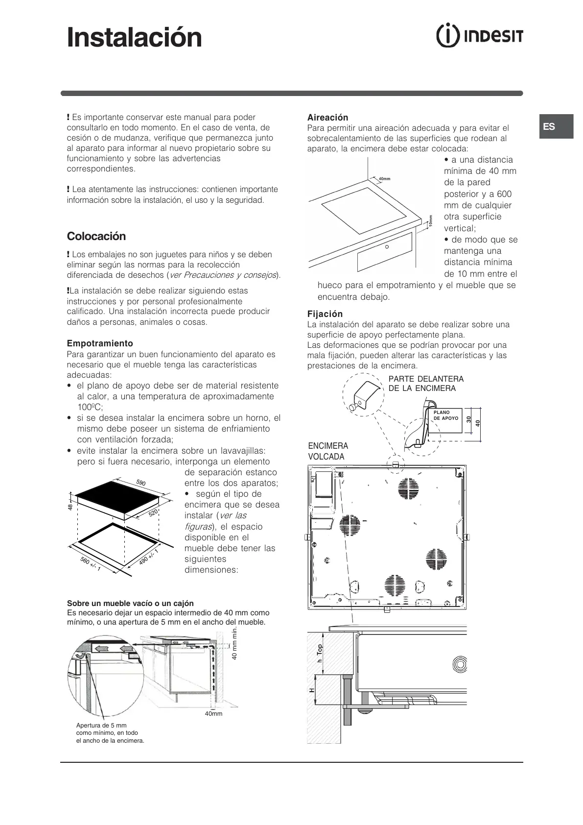 aparato, la encimera debe estar colocada: