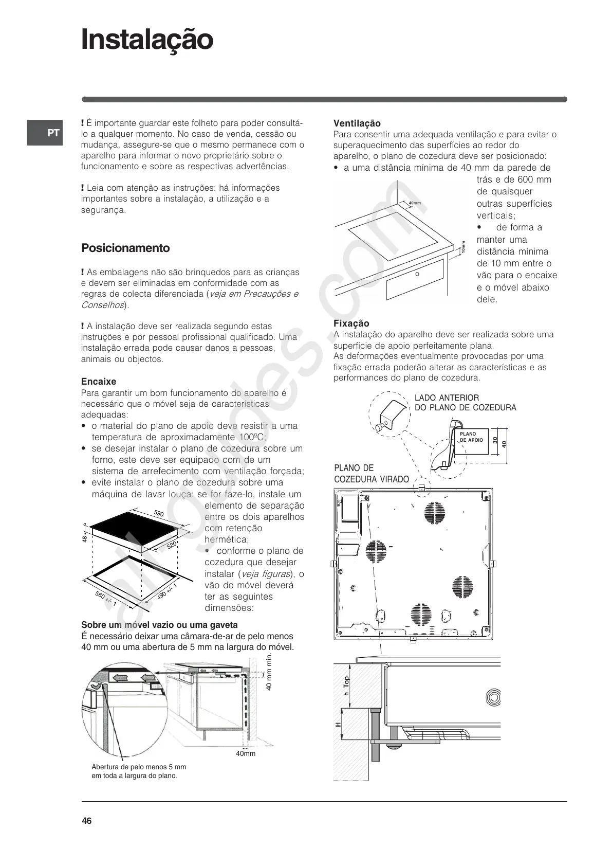 evite instalar o plano de cozedura sobre uma