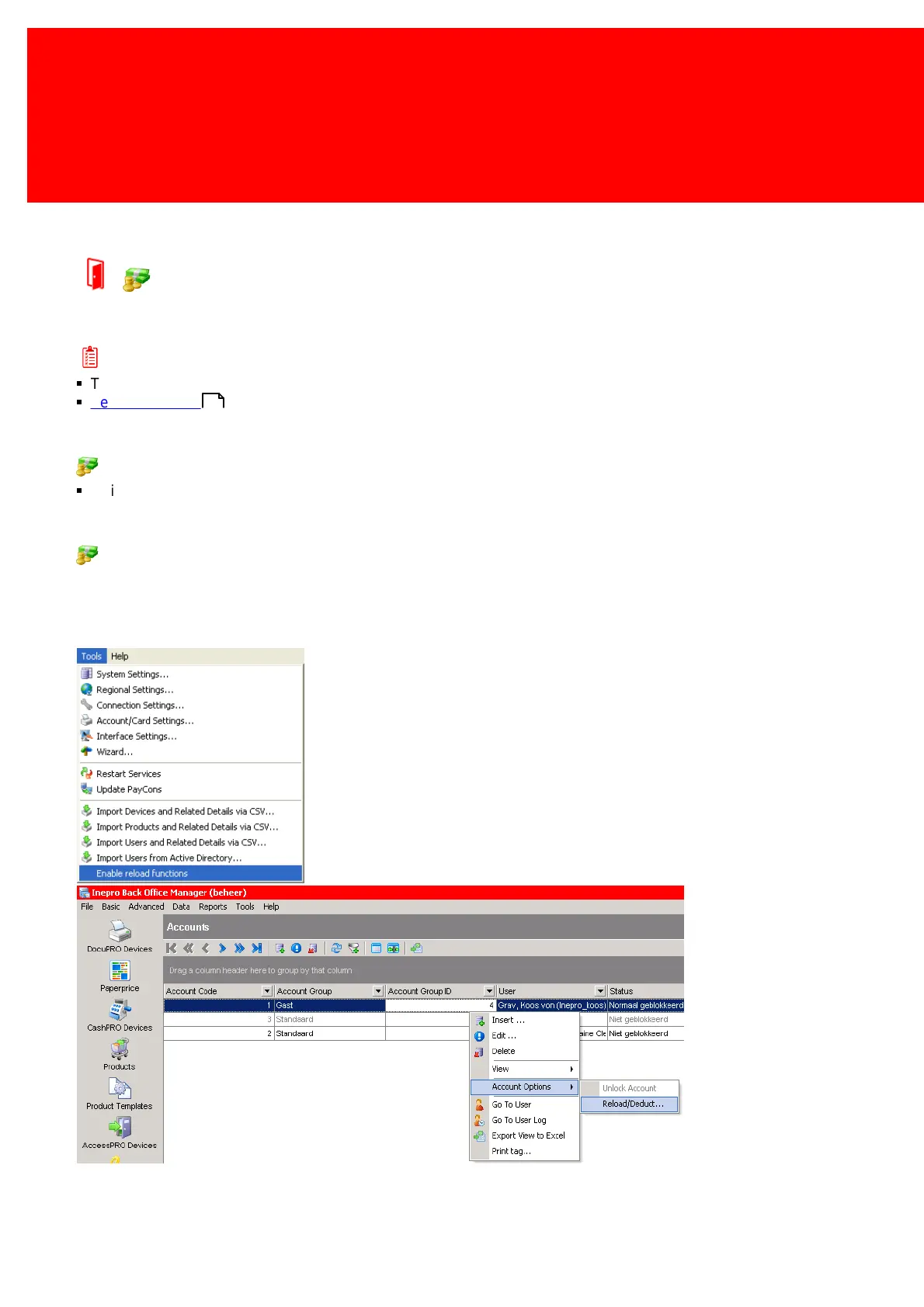 To reload the Accounts with money the reload functions must be enabled by choosing the option in the Tools menu. After