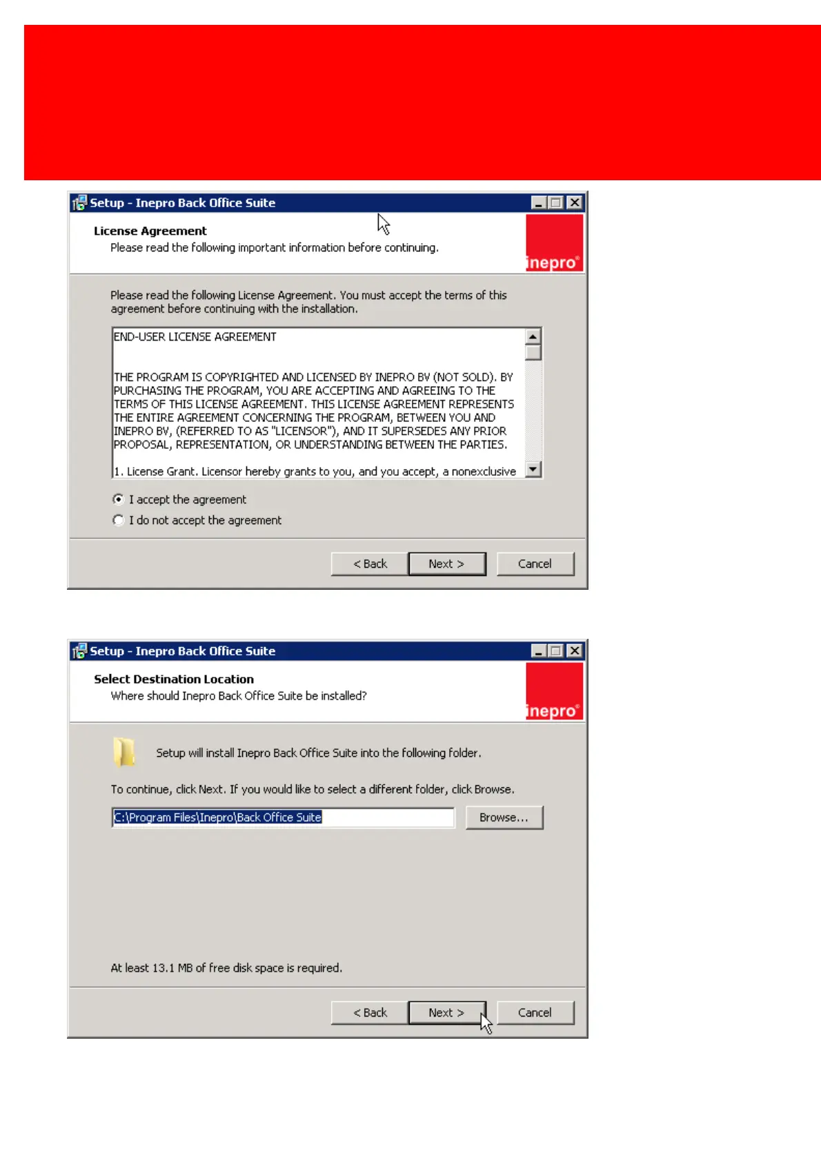 Select the folder where to install the Inepro Back Office Suite, click 'Next'.