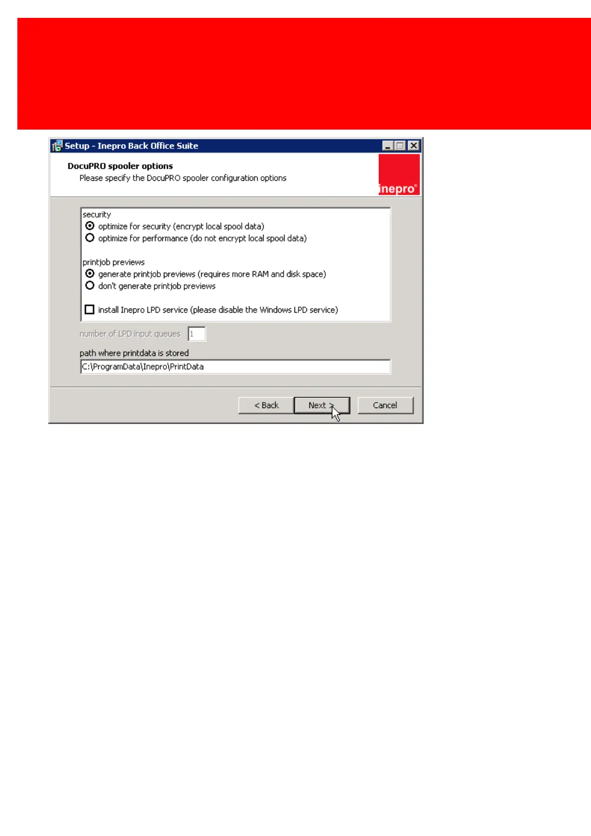 Path, this is the location where the print data (spool files) are stored. Click 'Next'.