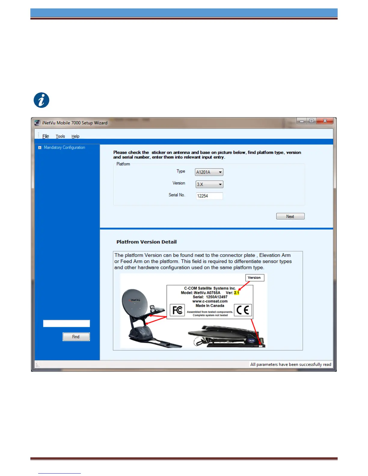 5. Configure the Platform Type, Version and Serial No. If no changes are needed press “Next” to