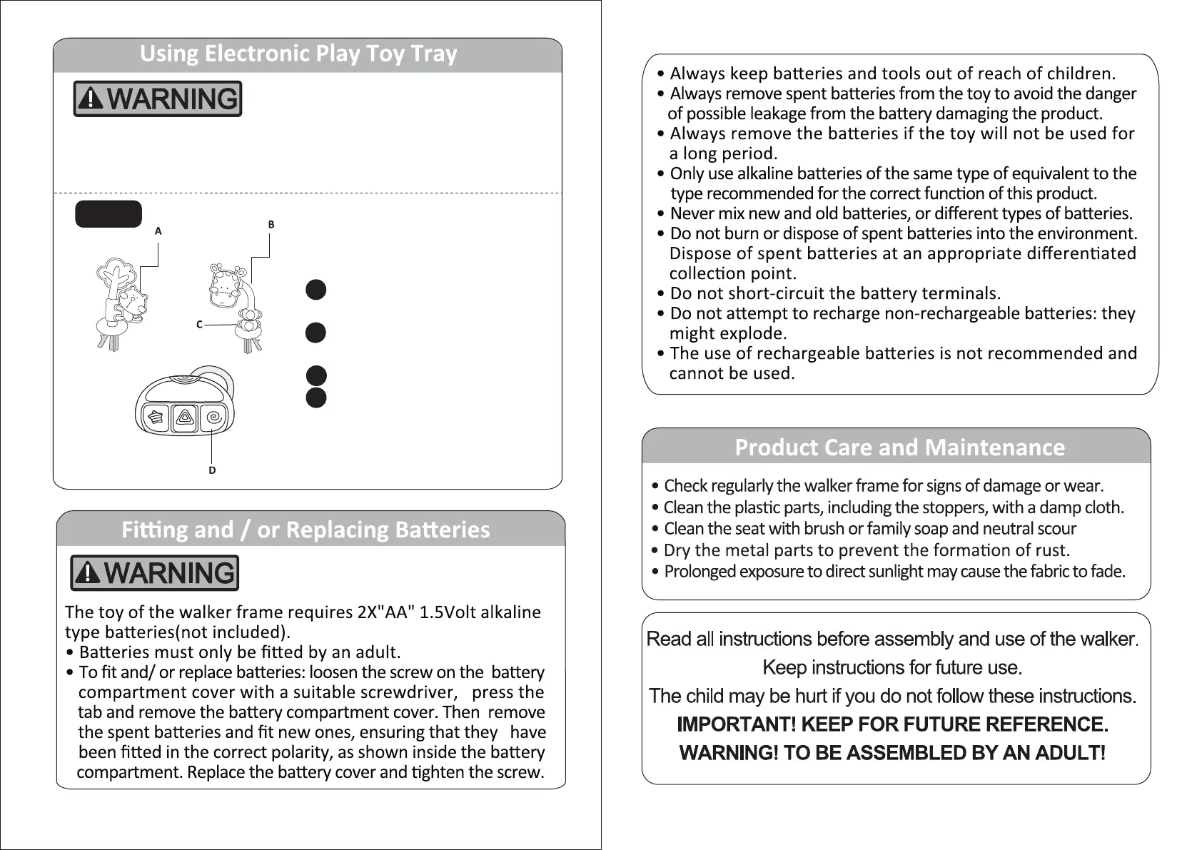 The walker includes one electronic play tray and one toy set that aached to the