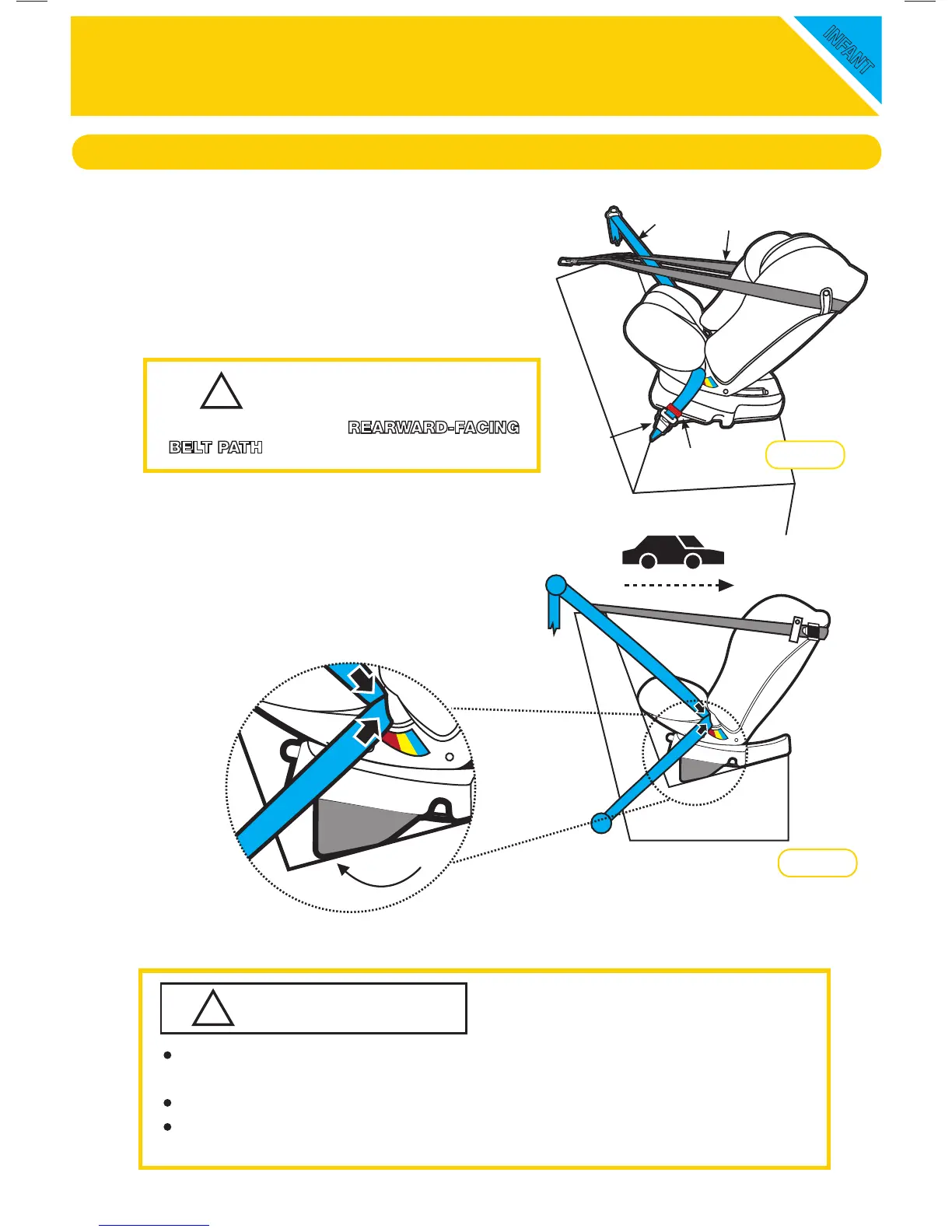 Infasecure CS4310 - Infant Seat: Vehicle Installation (Part 1); Seat Placement and Reclining; Upper Anchorage Strap Routing; Seat Belt Path Identification (Blue)