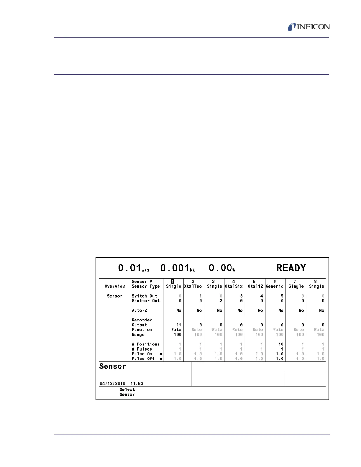 The Sensor Overview display, see Figure 4-1, shows the current configuration of