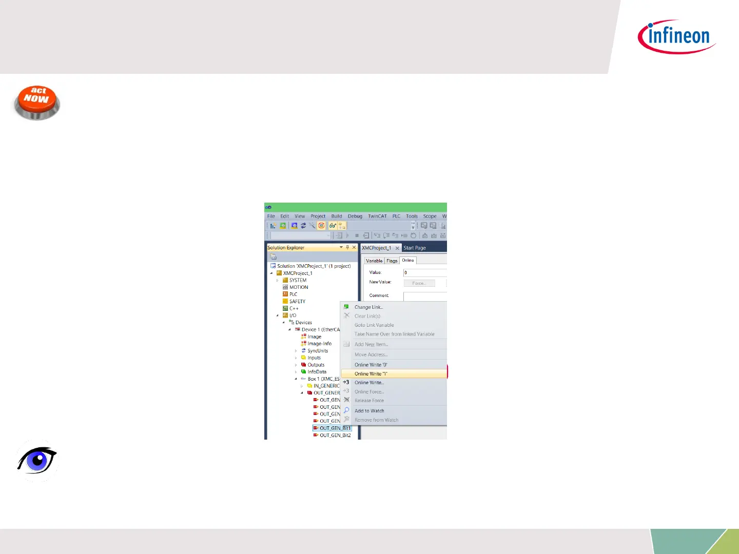 Right click on OUT_GEN_Bit1 of the slave node and select „Online