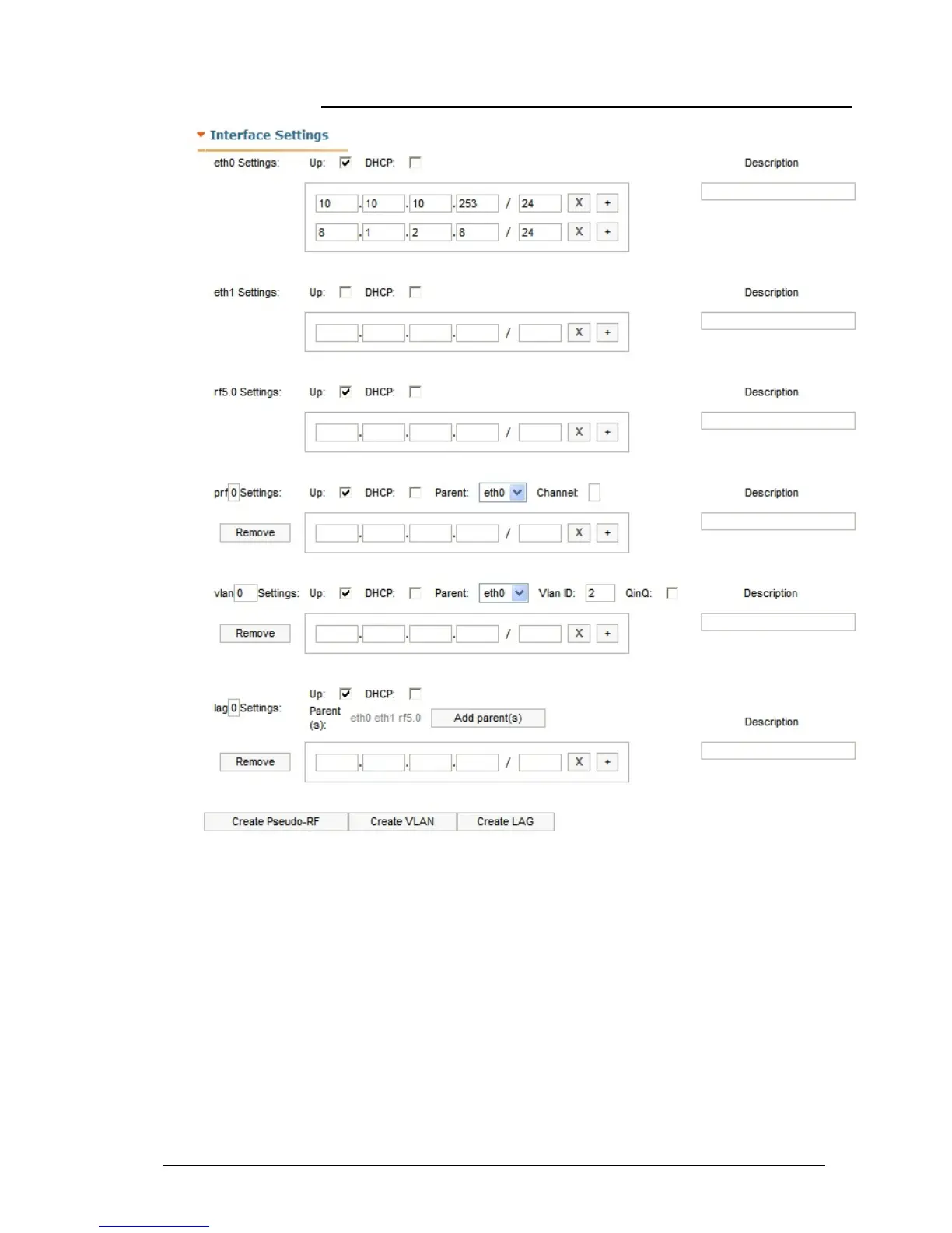 • “DHCP” check-box allows starting DHCP client on the interface