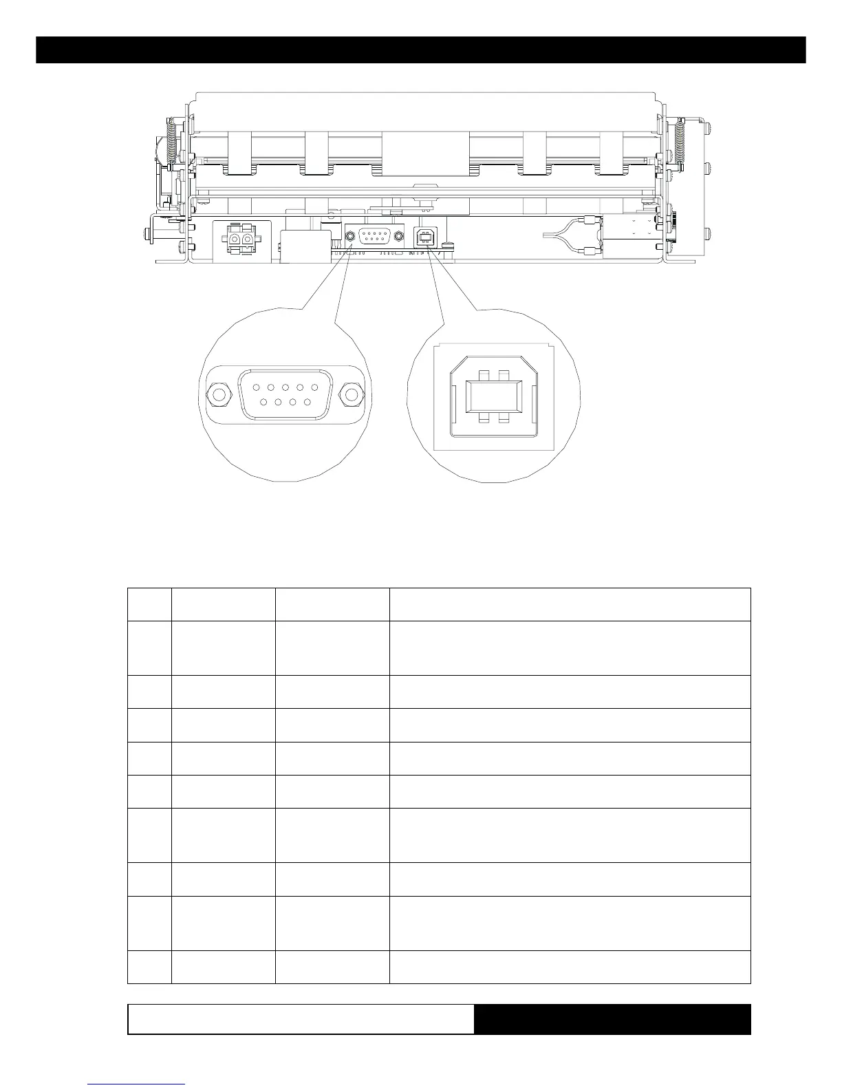 The printer has an RS232 interface with 9-pin female connector. Refer to the