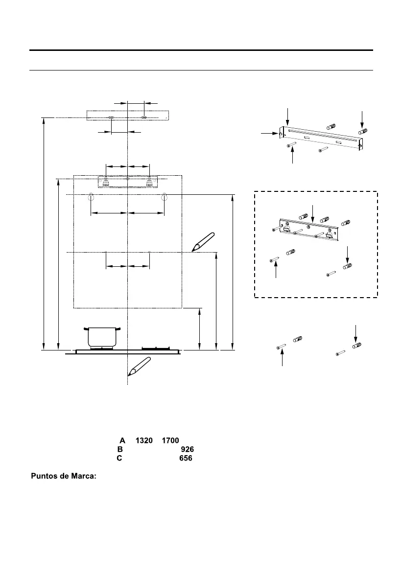 Marque um ponto (2) na linha horizontal B, 80 (135 opcional) mm à direita da linha de