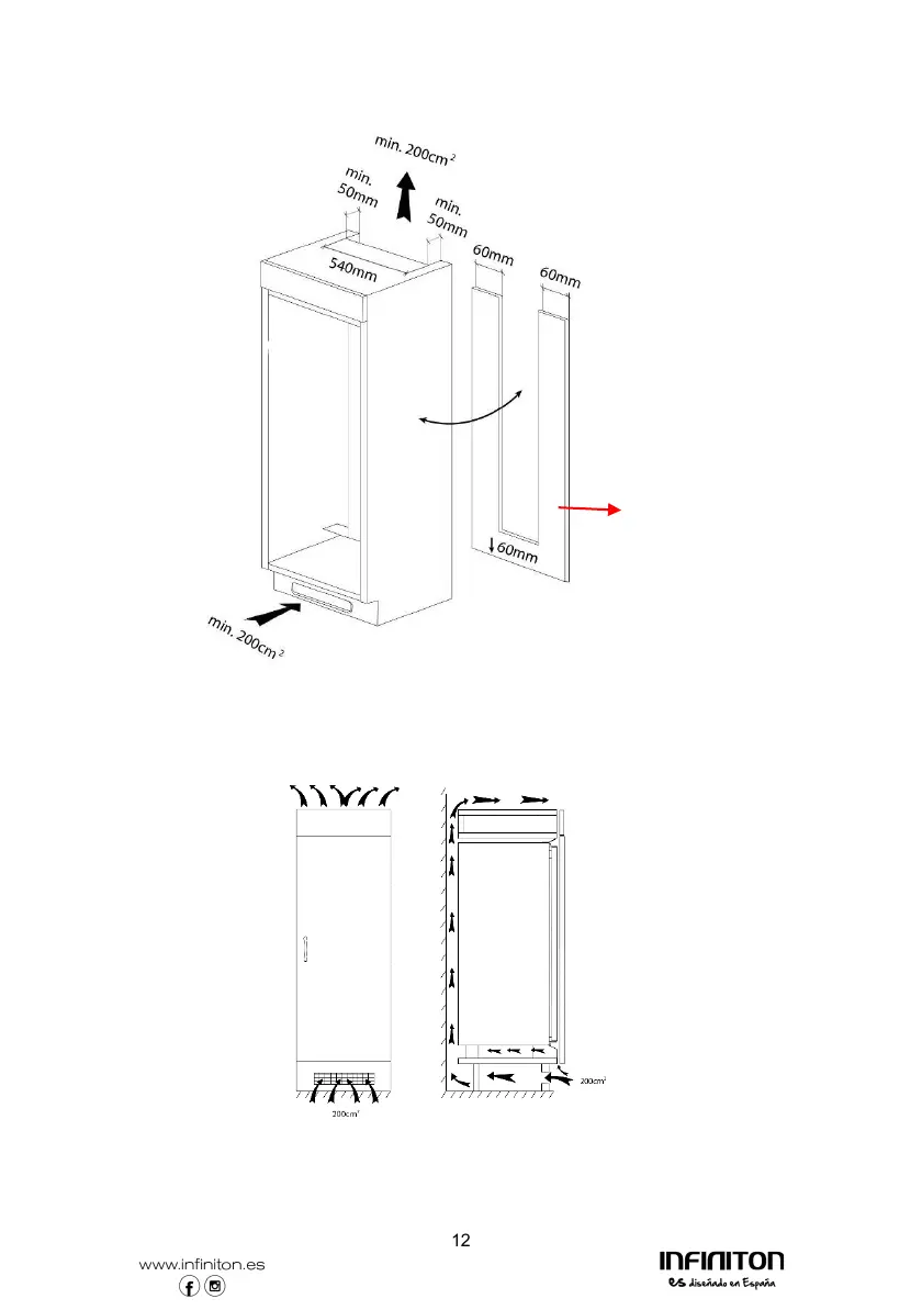 O armário em que o aparelho está alojado deve ter um recesso de ventilação de