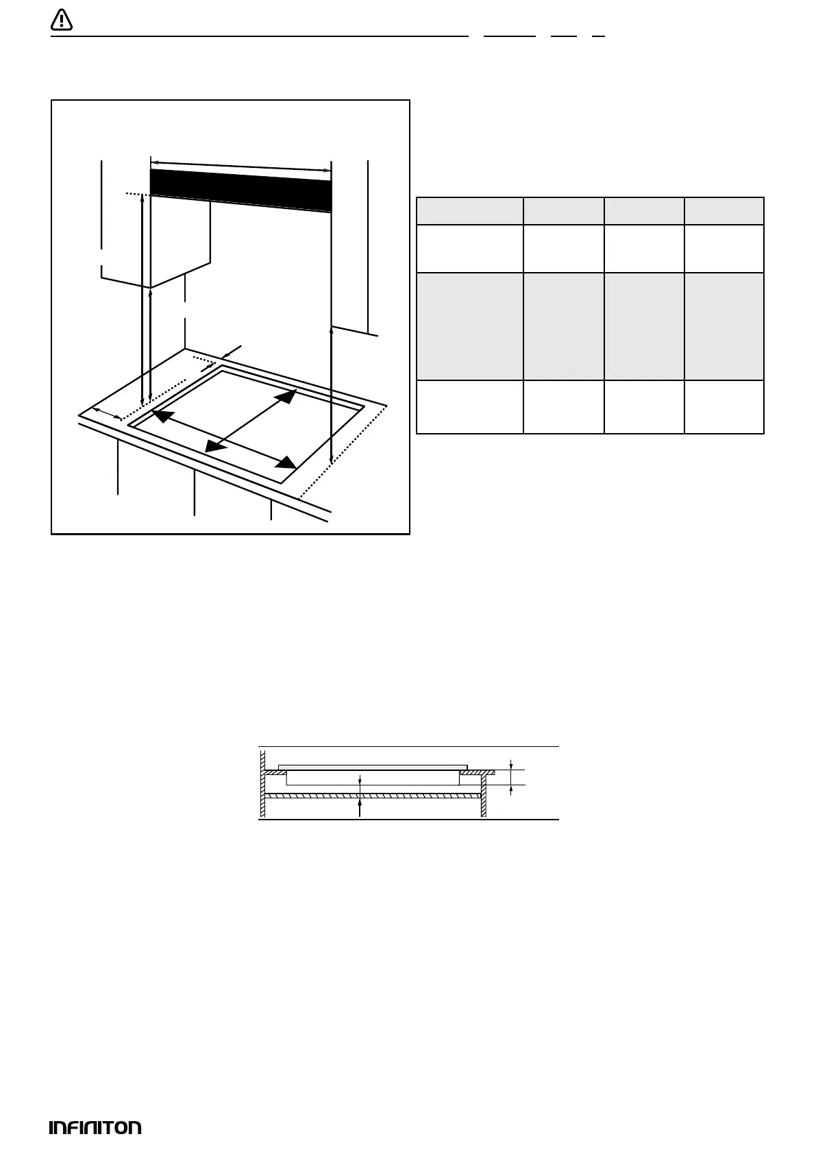 • 700mm entre o ponto mais alto da superfície da placa (incluindo os queimadores) e a parte inferior