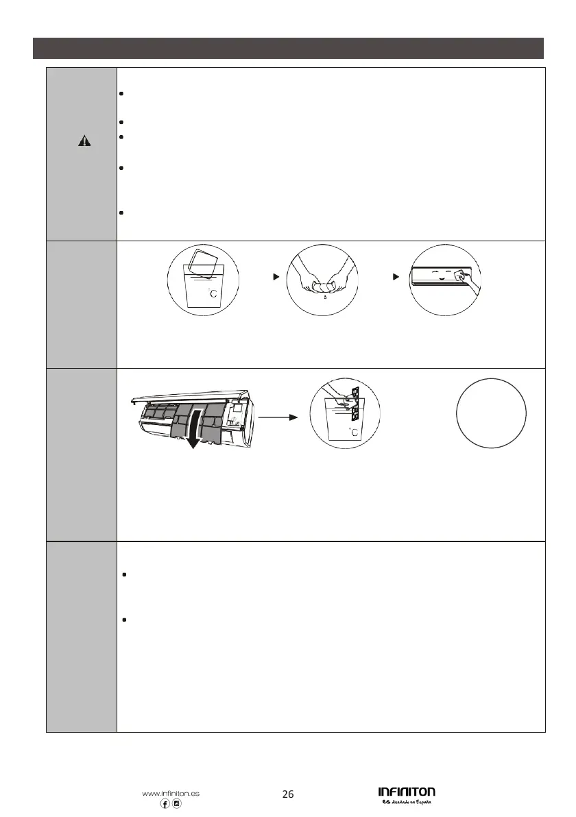 After removing the filter screen, do not touch the fins of the indoor unit to avoid scratching.