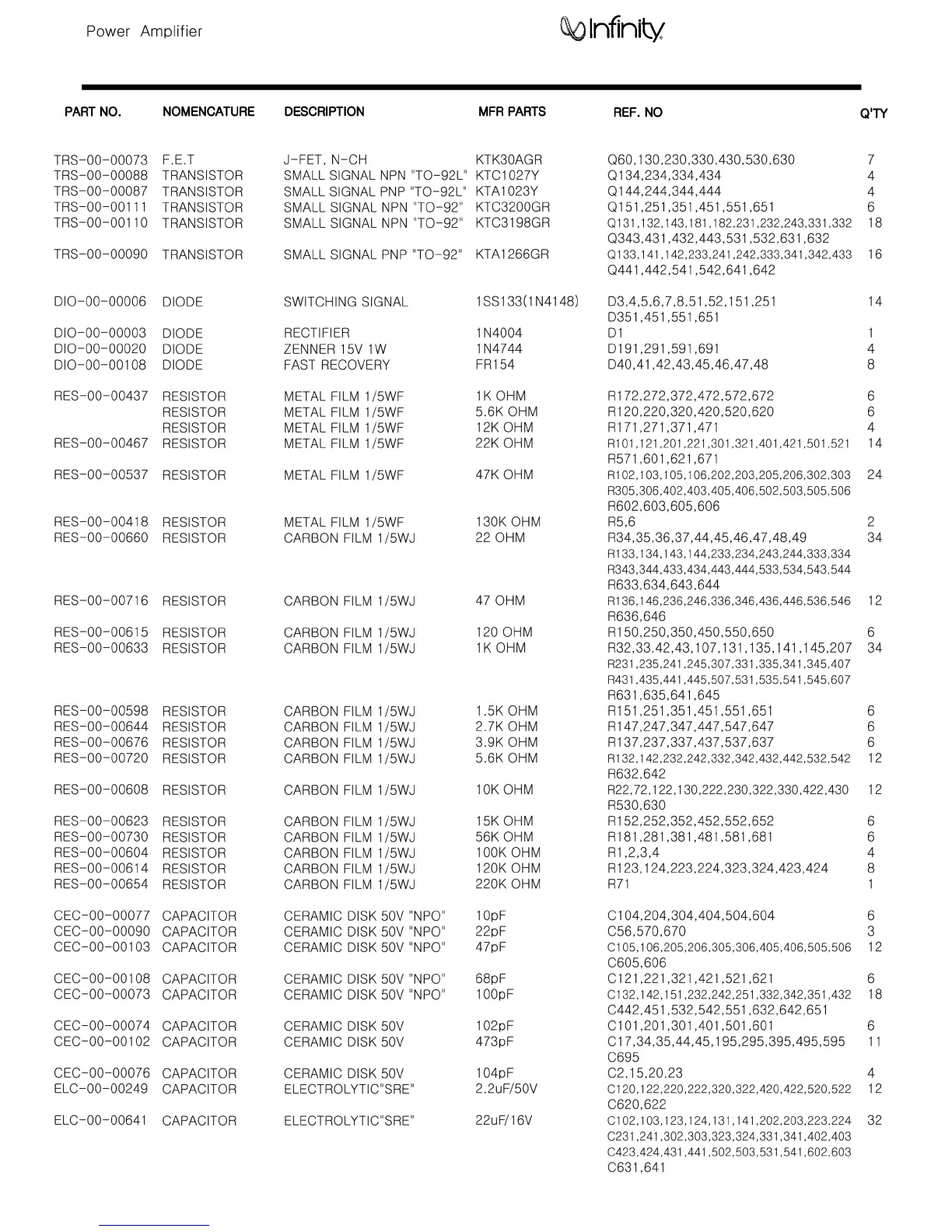 Infinity 5761A - Electrical Parts List