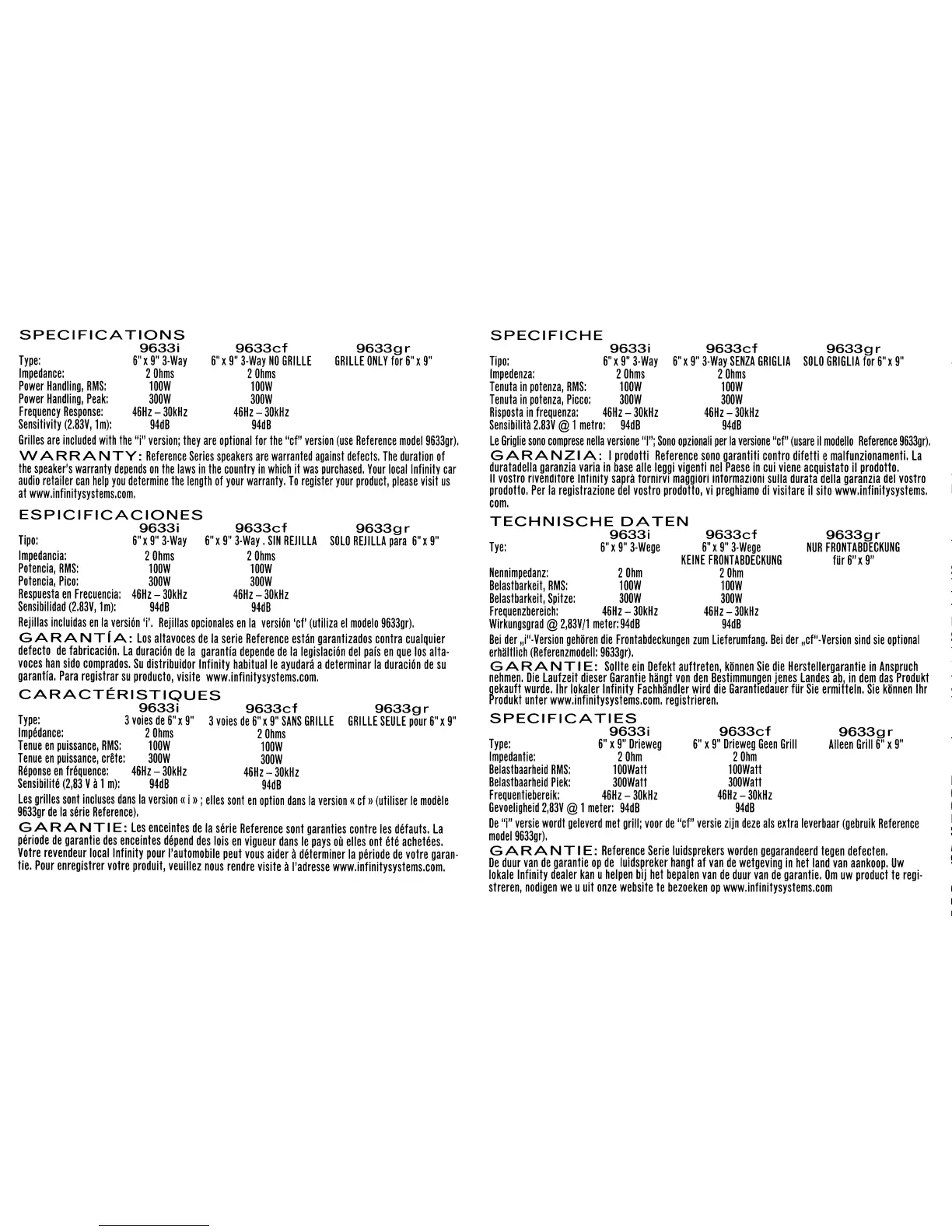 Infinity 9633i - Product Specifications; Model Series Specifications