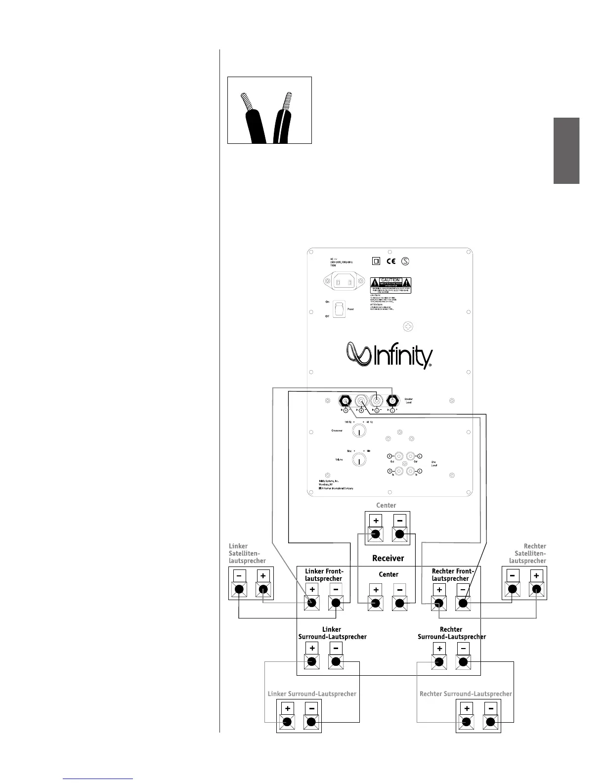 beschriftet. Die (+)-Litze des Lautsprecherkabels ist farblich markiert. Bitte verbinden