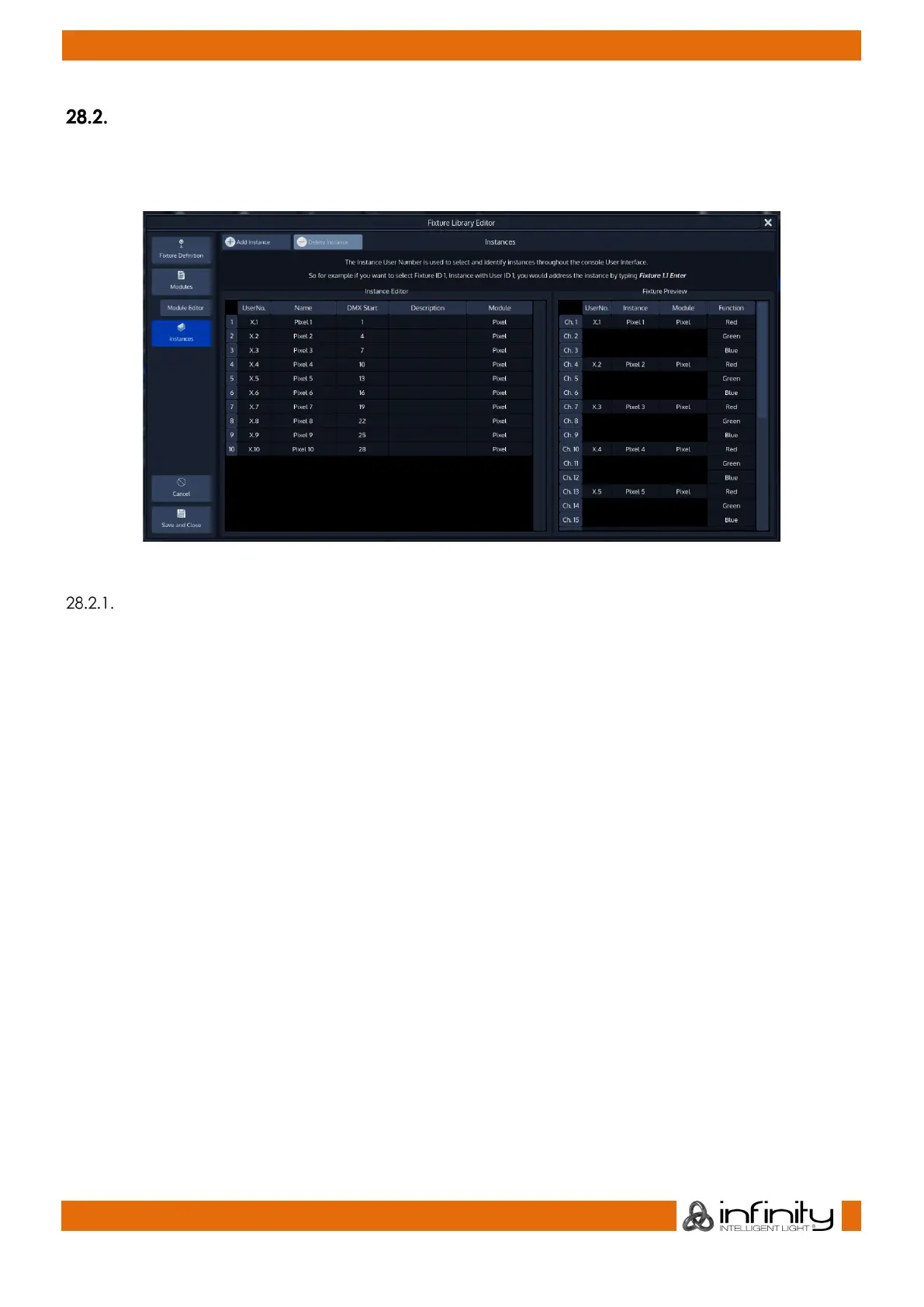 three channels (ie. RGB) for a 10 pixel, 30 channel fixture and create 10 instances which are using this