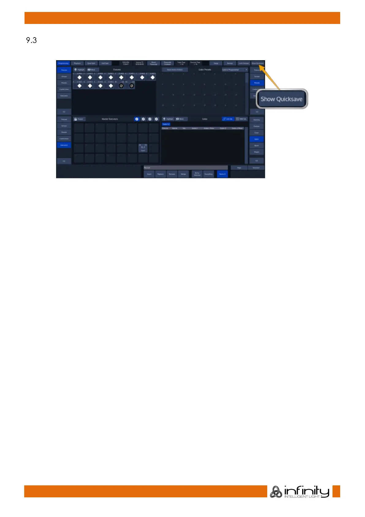 To save your Showfile hit the Show Quicksave button within the touchscreen displays Top Toolbar,