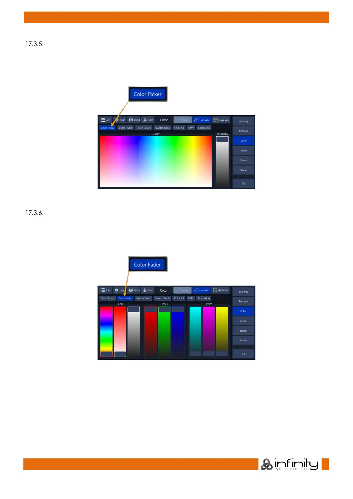 To control color values using HSI or different faders (for RGB and CMY), no matter the color mixing system