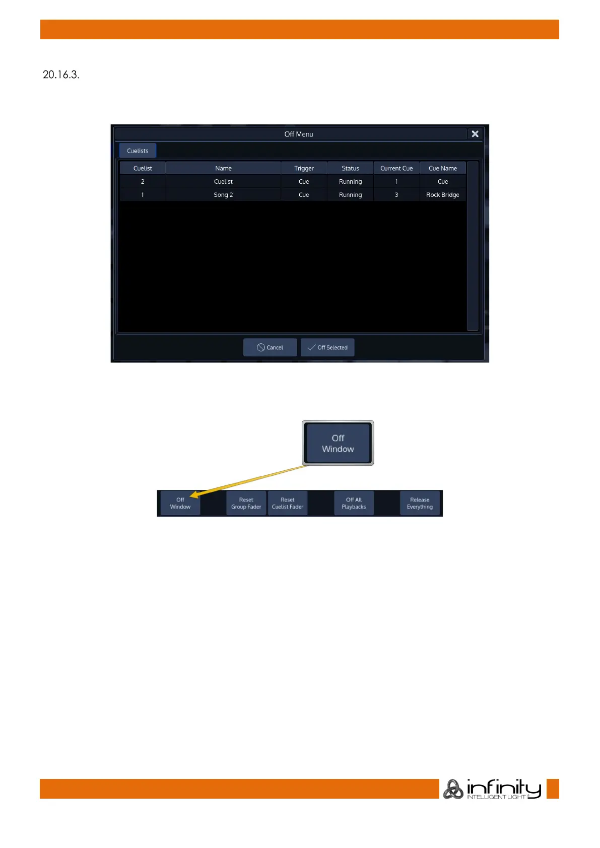 The Off Window may be used to easily switch off running cuelists and to get an overview of the current