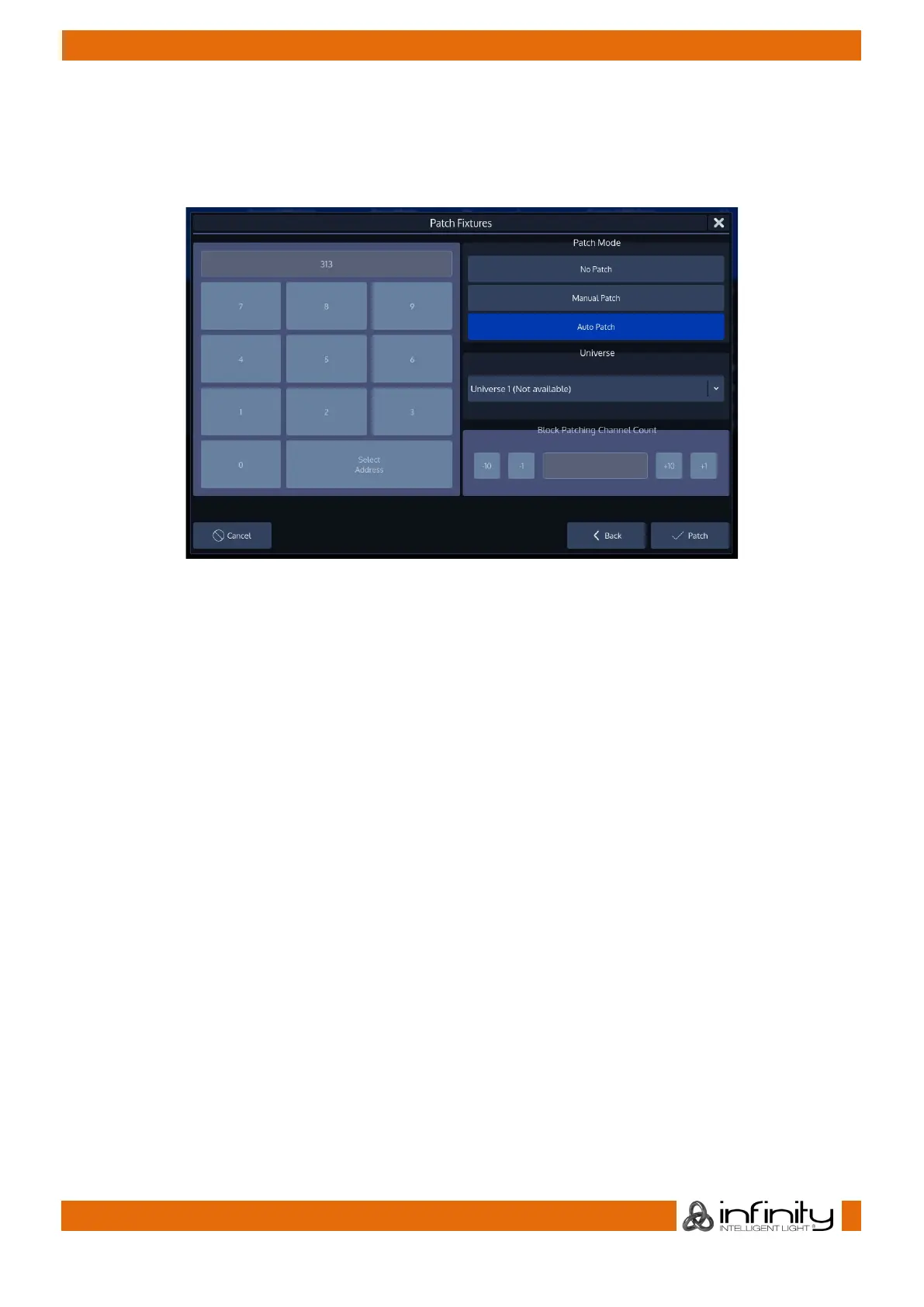 The next screen is used to patch the fixtures to the DMX-Universes. For an explanation of the options,