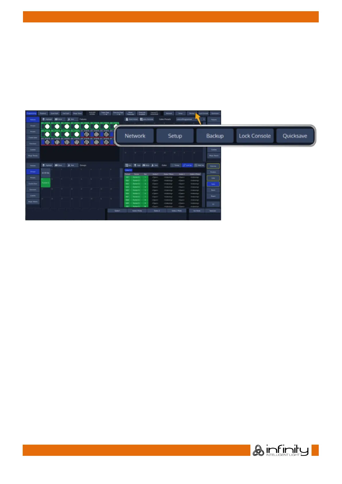 The Setup and Backup buttons show the corresponding menus to patch fixtures, setup preferences or to