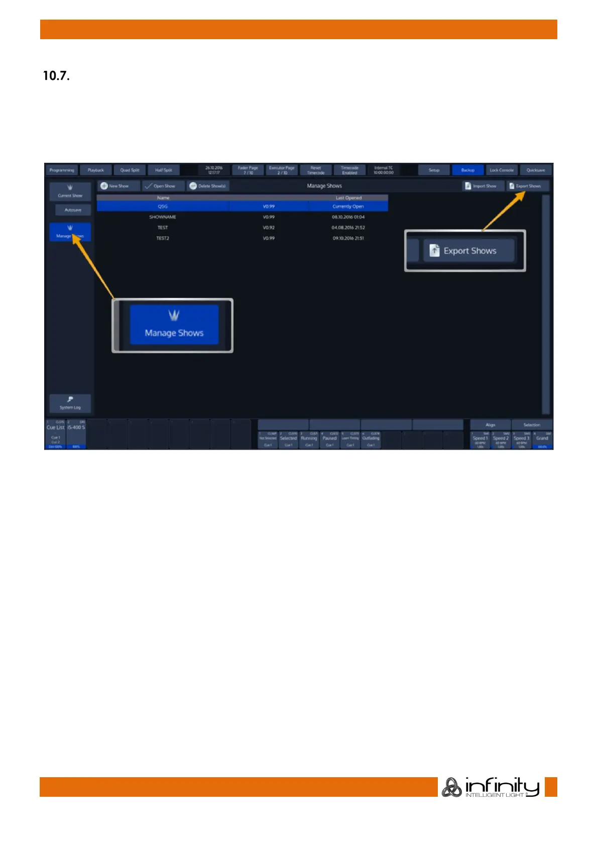 From within the Manage Shows screen, select all shows to be exported from the list. Click on Export Shows