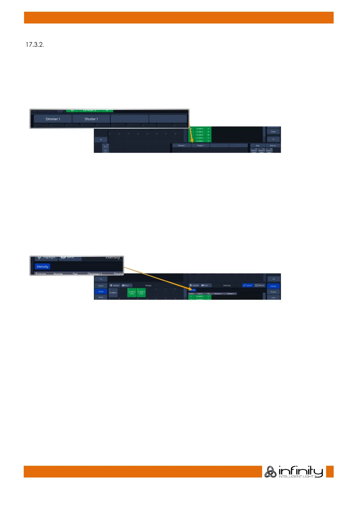 For example, in order to adjust the Dimmer level, select Intensity from the side menu.