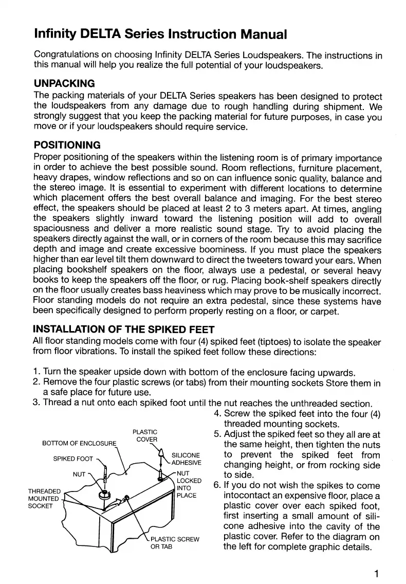 Infinity DELTA - UNPACKING; POSITIONING; INSTALLATION OF THE SPIKED FEET