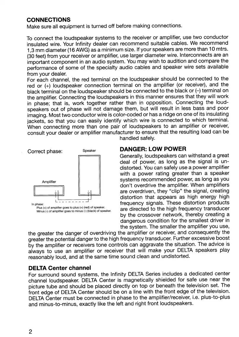 Infinity DELTA - CONNECTIONS; DANGER: LOW POWER; DELTA Center channel