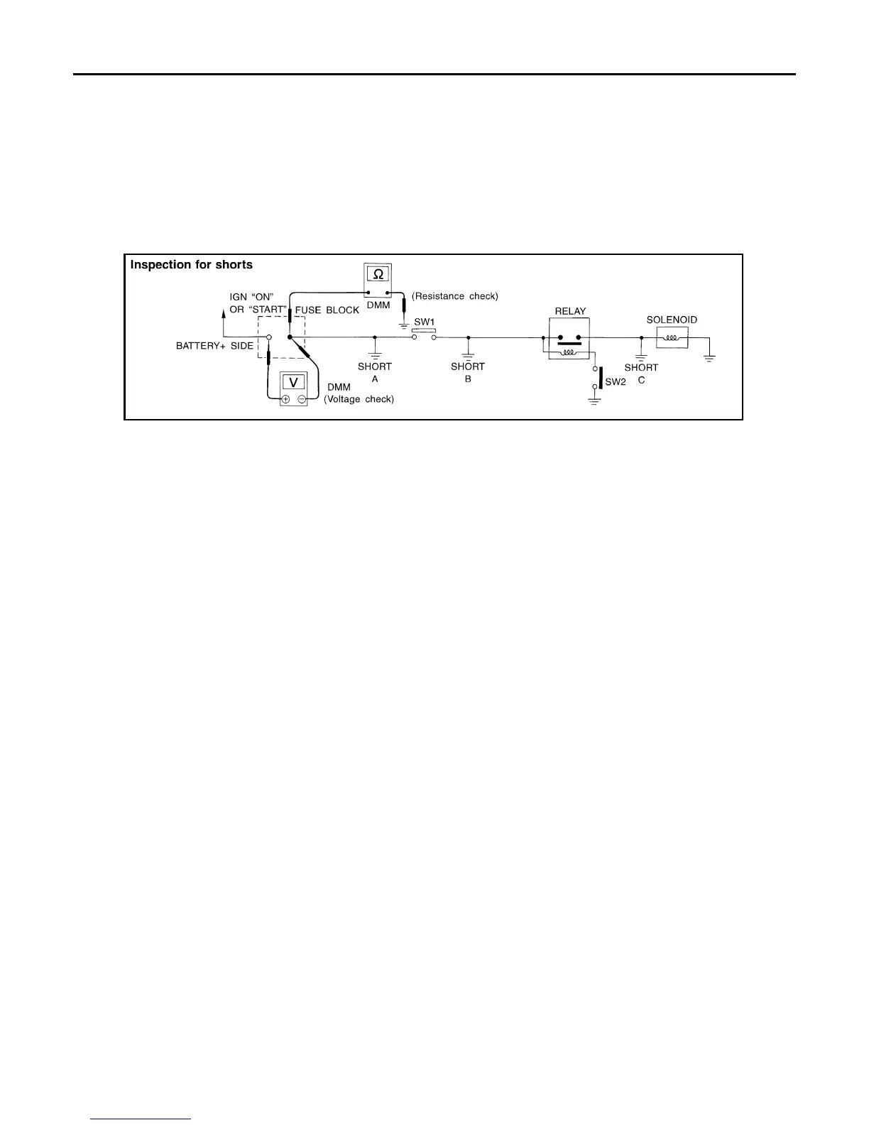 voltage; short is down the circuit of the relay or between the relay and the disconnected solenoid (point C).